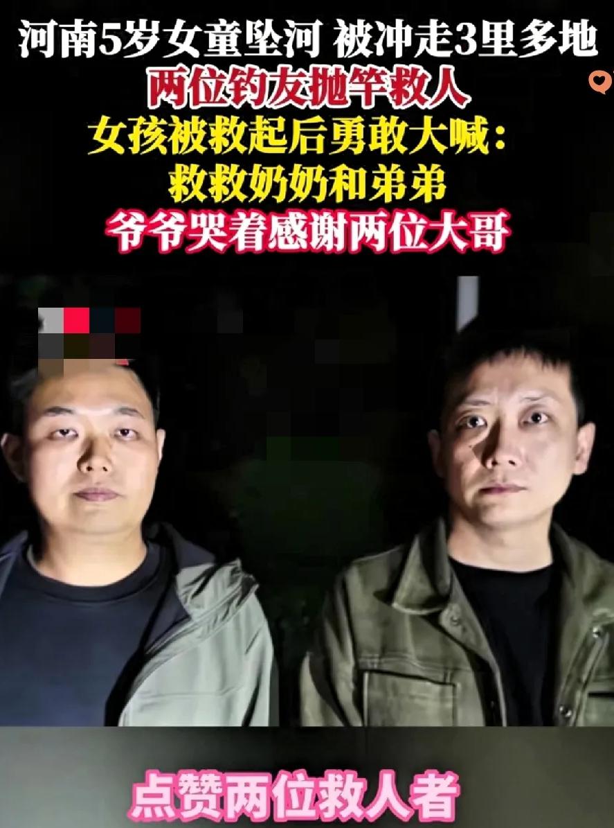 真的被这一幕暖到了! 10月13日晚上,邓州一个小女孩和爷爷奶奶、弟弟过桥时不慎落水。 爷爷、奶奶和弟弟都自己爬上了岸,唯独小女孩被湍急的河水卷走。 就在所有人都揪着心的时候,下游两个夜钓的大哥听到了哭声。 一般人可能会吓得收拾东西走人,可他们没有! 循着声音望去,只见河面上漂着一个穿红衣的小身影。两人立刻用鱼竿钩住她的衣服,稳稳地把她拽到岸边。 后来才知道,小女孩穿着厚外套,在冰冷的水里漂了足足三里地! 要是晚一步,要是那两位大哥没多留一会儿,后果不堪设想。 这不是运气,而是善良和勇气的接力。很多时候,生命的转机,就藏在陌生人的一个决定里。 你身边有没有过这样的“绝处逢生”故事?或者遇到过让你佩服的好心人?来评论区聊聊吧!