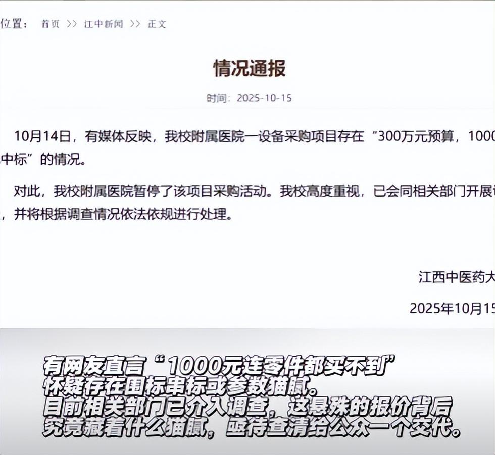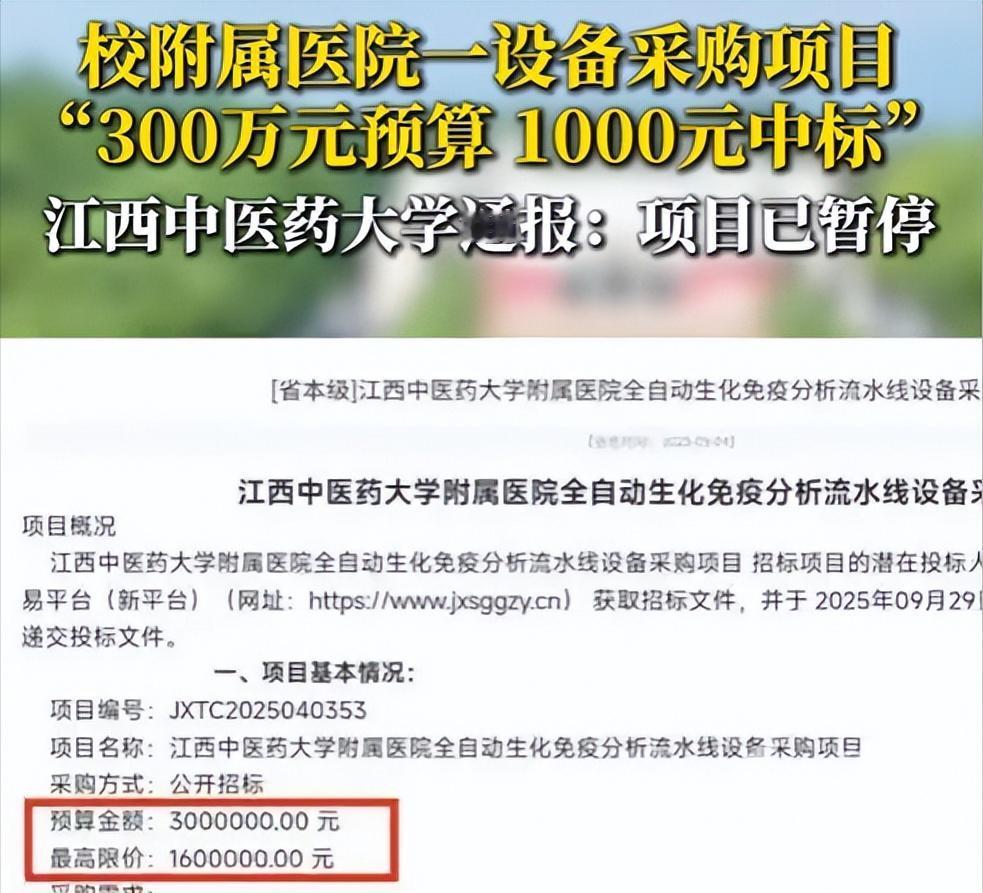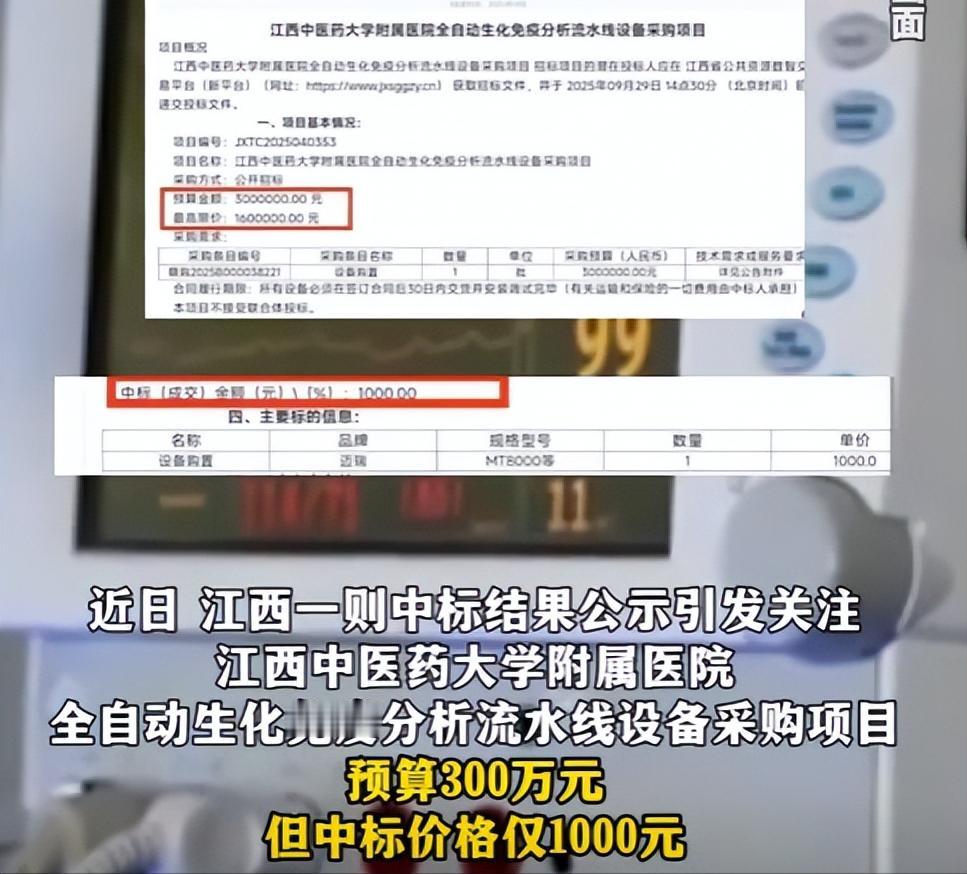 300 万预算买医疗设备,最后 1000 元敲板 —— 江西中医药大学附属医院这则采购公示,把 “离谱” 俩字焊在了公众眼前。 9 月 4 日项目刚挂出,300 万预算、160 万最高限价,看着挺正规。可 10 月 9 日中标结果一出来,谁都懵了:迈瑞 MT8000 全自动生化免疫分析流水线,市场价几十万起步,1000 元连个核心零件都买不到,却成了中标价。 10 月 14 日媒体追问,医院接线员还嘴硬 “按流程来,有询价会”。可 300 万到 1000 元的差距,哪是 “询价” 能缩的?这话刚出口,江西省财政厅说要查,学校也发通报暂停项目。 网友却不买账,调侃 “自查自罚最后自罚一杯”,甚至戳穿 “经费怕不是流进了私囊”。大家要的不是 “暂停调查” 的场面话,是知道 1000 元买的啥、300 万预算咋定的。 公共资金不是糊涂账,医院采购连着患者安危。300 万到 1000 元的鸿沟,填不满的是公众信任;调查若走个过场,丢的不只是医院的脸,更是公帑的公信力。