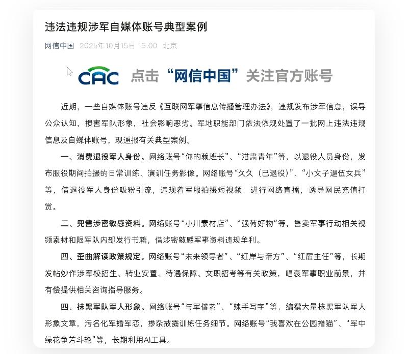 抹黑军队军人形象,吸粉引流,这黑心钱,也能赚?部门依法处置了一批网上违法违规信息