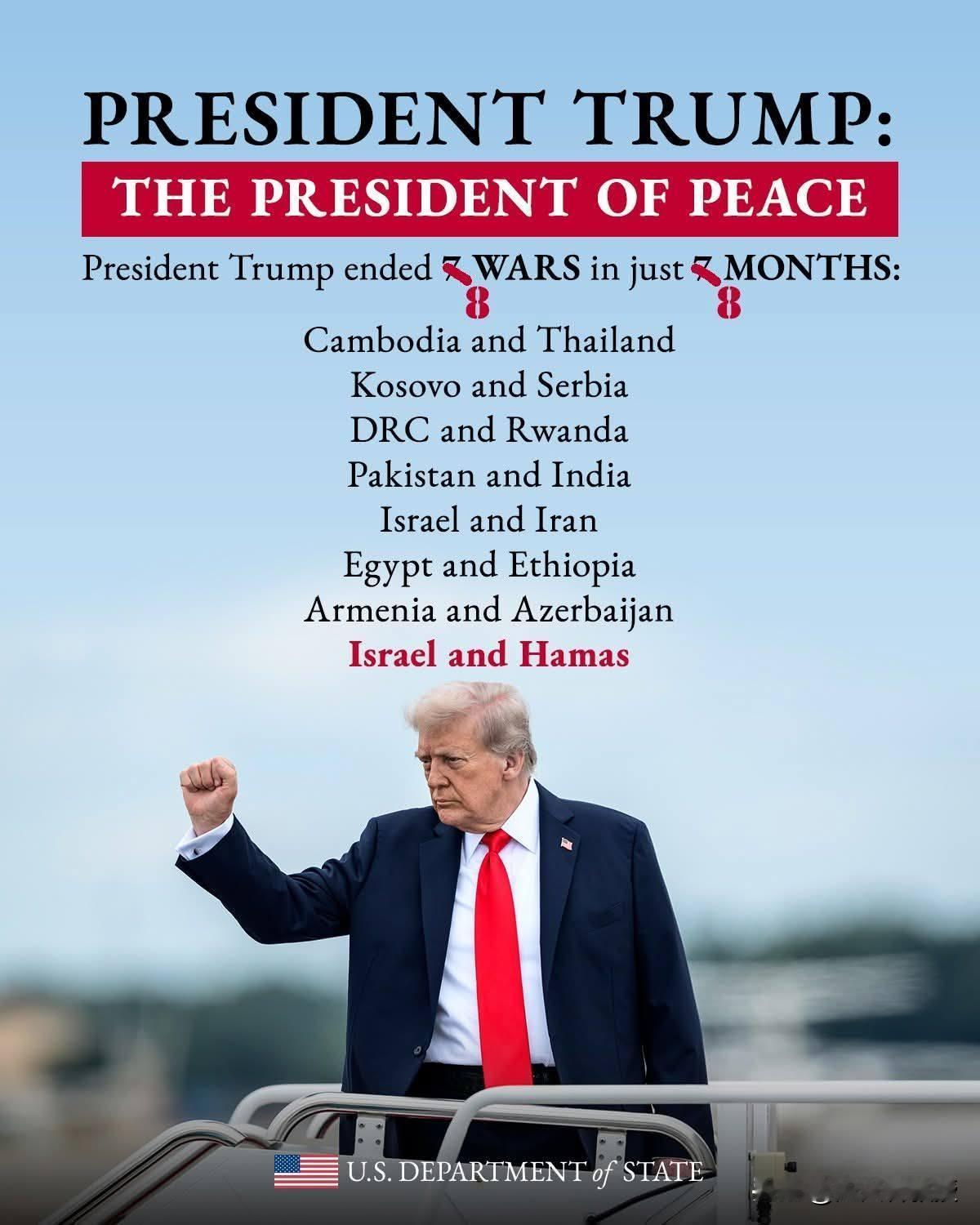 特朗普一直以“和平总统”自居,之前专门发文称他促成了七起和平,制止了战争,虽然有相关当事方并不认可,比如印度就不承认是特朗普促成了印巴停火。这还惹恼了特朗普。 现在,以色列和哈马斯签署了和平协议,特朗普马上更新了自己的记录,把“7”改为“8”。 特朗普确认为促成以色列和哈马斯的冲突努力了,但以色列在加沙打死7万多巴勒斯坦人,美国对以色列的资金和武器援助也负有很大责任。 所以,不能只记解决问题的功劳,同时也要记制造问题的责任。 特朗普离诺贝尔和平奖的距离还很遥远!