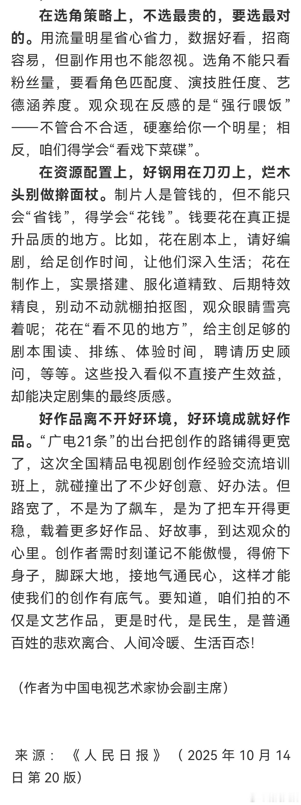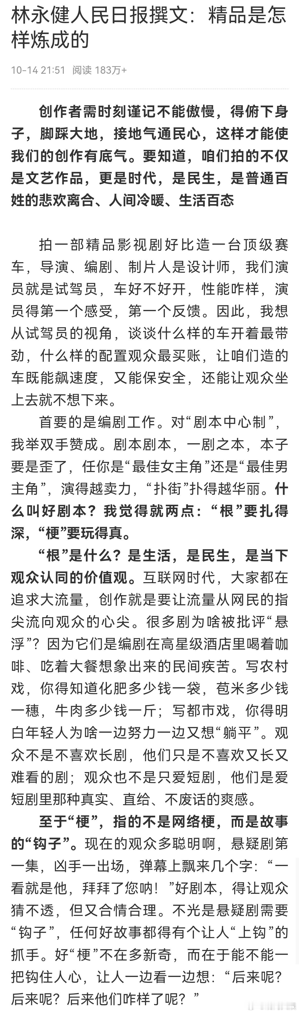 林永健在人民日报撰文,谈如何制作精品好剧,从编剧、导演、演员等方面都提出了批评和建议。