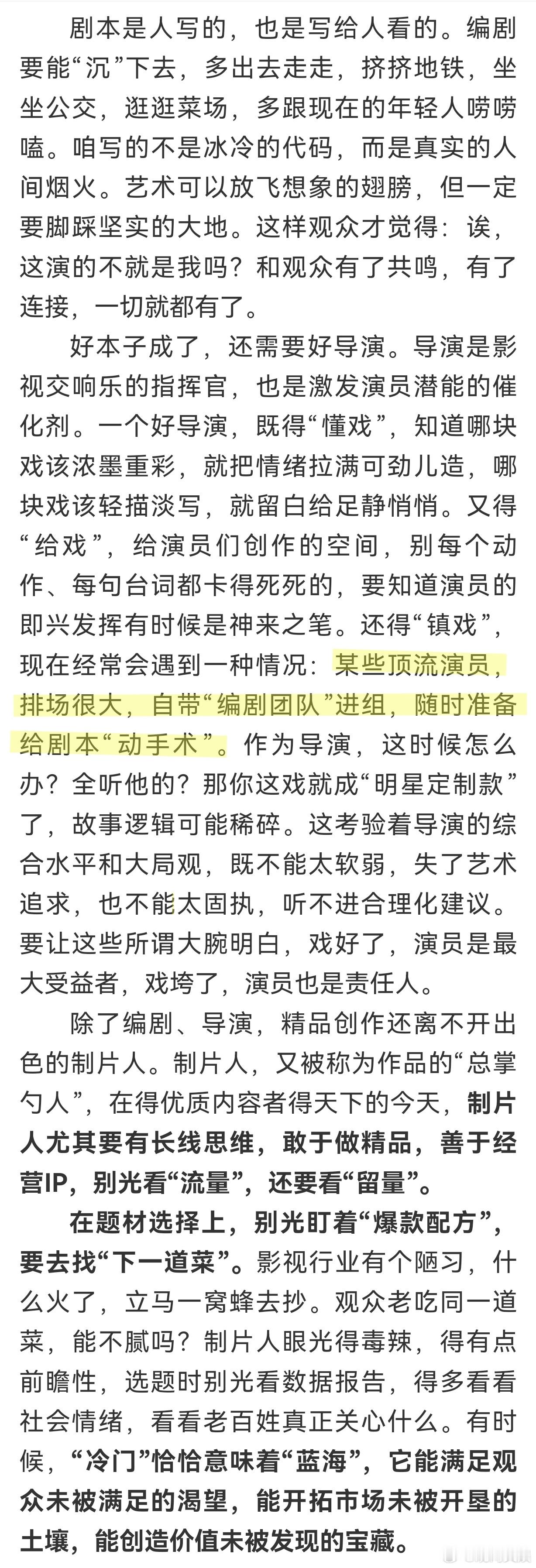 他说现在经常会遇到一种情况:某些顶流演员,排场很大,自带“编剧团队”进组,随时准备给剧本“动手术”。作为导演,这时候怎么办?全听他的?那你这戏就成“明星定制款”了,故事逻辑可能稀碎。这考验着导演的综合水平和大局观,既不能太软弱,失了艺术追求,也不能太固执,听不进合理化建议。要让这些所谓大腕明白,戏好了,演员是最大受益者,戏垮了,演员也是责任人。