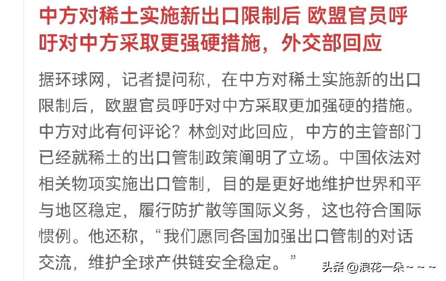 急!急!告急! 欧盟急,美国急,都急了? 美国大豆就不说了,美国农民都哭晕在厕所了,美国政府是一点办法也没有。虽然美政府想办法给一点补助安慰一下,但是你不能让大豆烂在地里或放在仓库里堆着长霉吧。因为生产了那么多大豆,其他小国家没人要,人家自产自用就够了,大国家呢?都学会打贸易战了,根本不吃老美那一套。 然而,与此同时,欧盟也坐不住了。这不,因为稀土问题竟然要求出口技术,想跟美国使用一样的套路,一边张口要一边还要恐吓。就像今年的诺贝尔经济学奖获得者所说的那样,欧洲科技早已经落后中美,必须要清醒过来。欧洲现在所谓的强硬也只不过是“打肿脸充胖子而已。”
