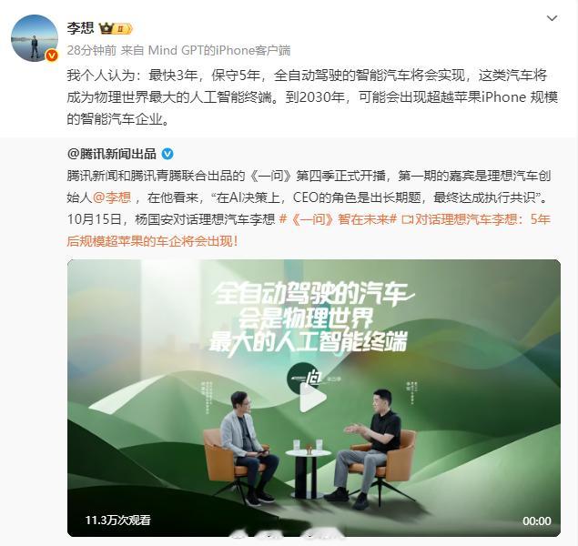 理想汽车CEO李想认为:最快3年,保守5年,全自动驾驶的智能汽车将会实现