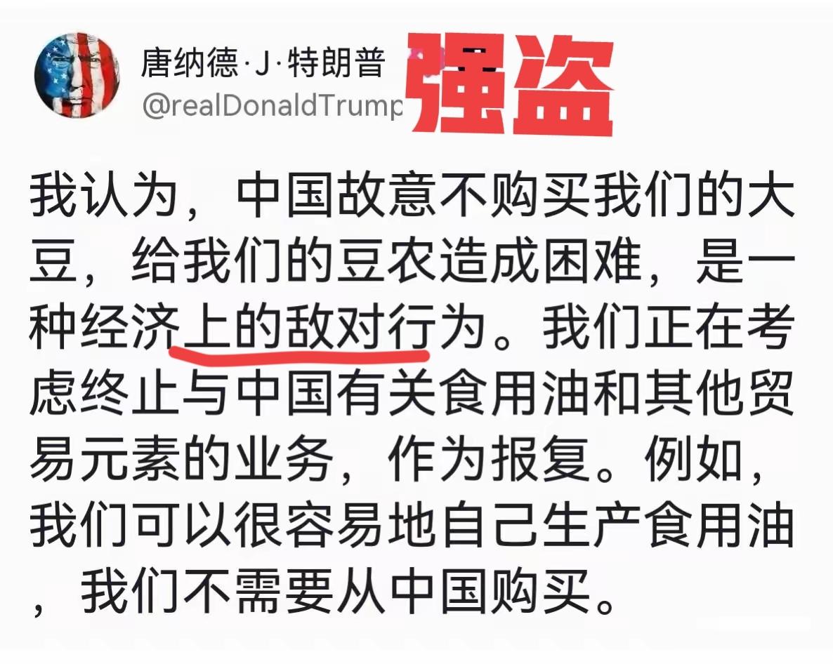 特朗普有病吧? 不买他们大豆就是敌对行为? 你们美国人爱生产什么油,吃什么油,关