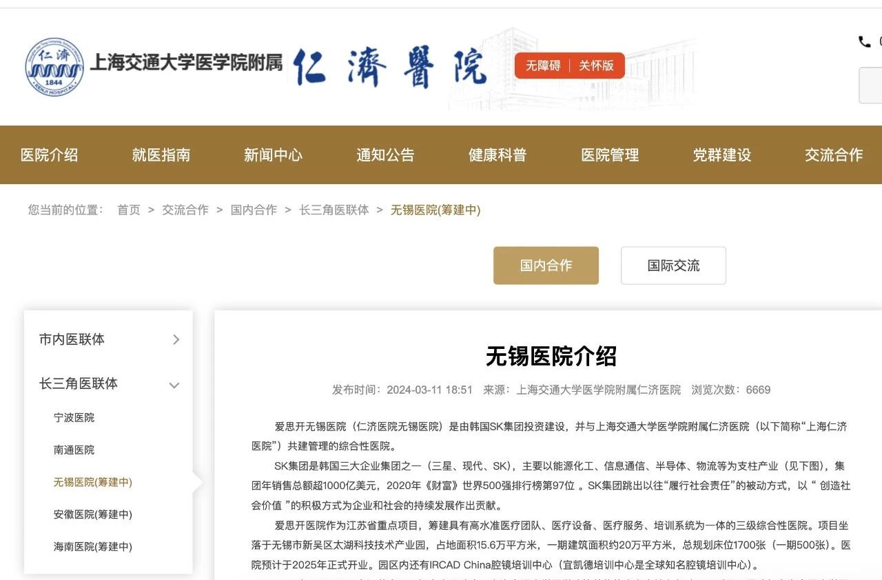 韩国SK集团投资建设的爱思开无锡医院(亦称仁济医院无锡医院)预计于2025年正式
