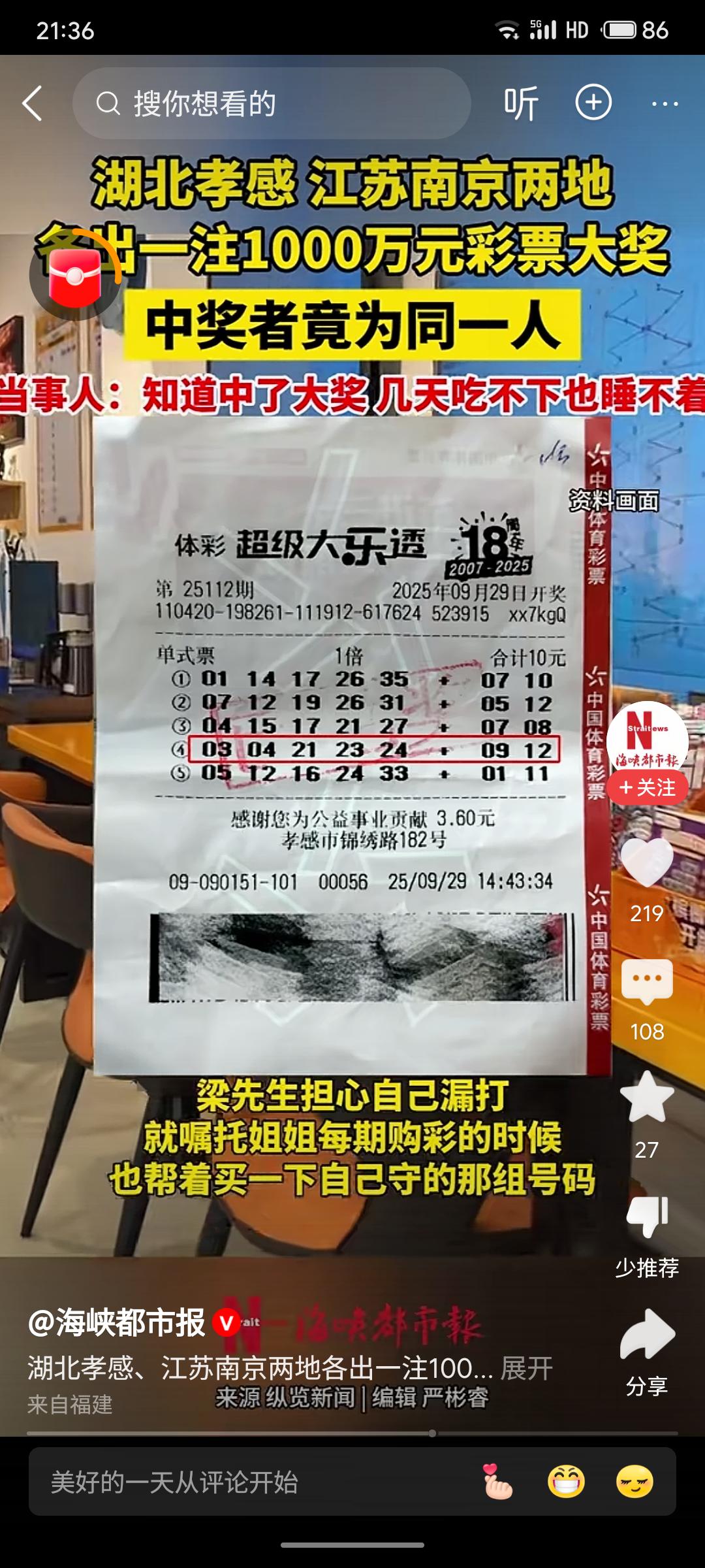 一名湖北孝感的梁先生(化名)在江苏工作生活,长期守号购买彩票。他委托在孝感的姐姐同期代为购买相同号码,结果在超级大乐透第25112期中,两地购买的同一组号码分别命中一等奖,各获1000万元。梁先生透露,这已是他第二次中得大乐透一等奖,得知喜讯后激动得数日寝食难安。此事戏剧性十足,引发广泛关注。
