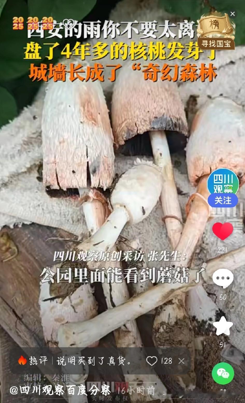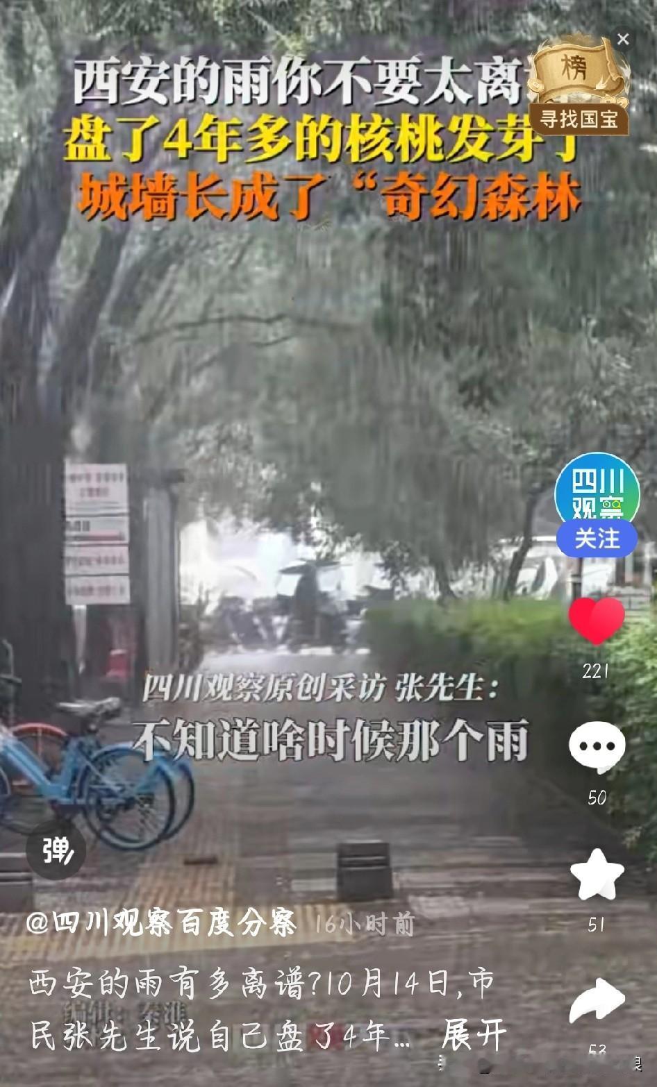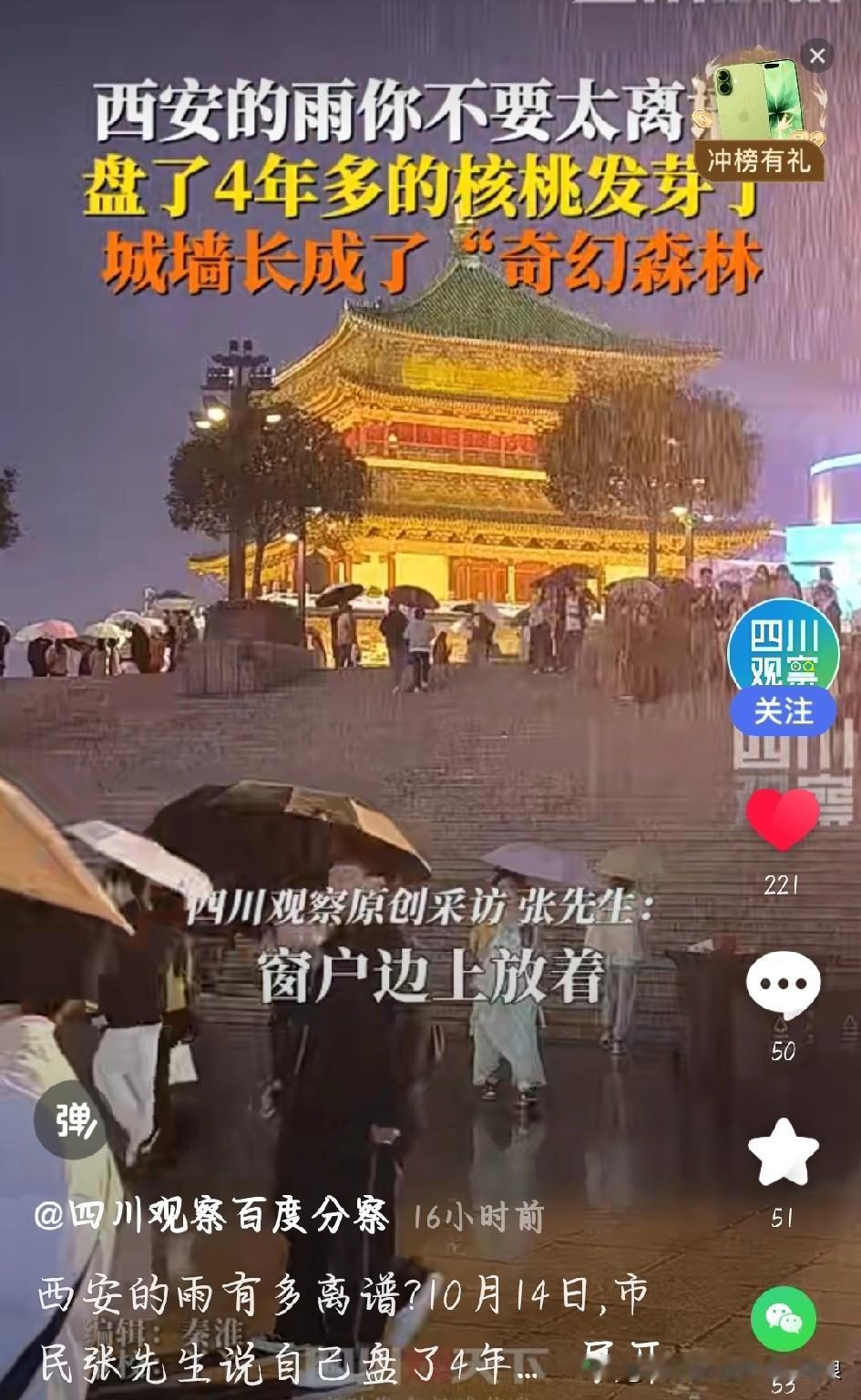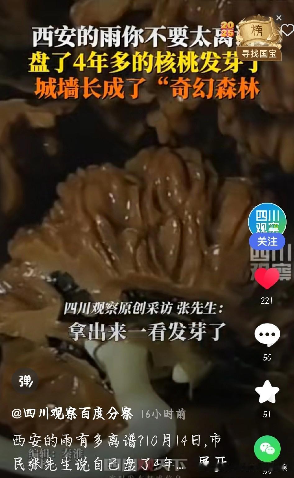 西安这雨下得是真魔幻,连下40多天,把古城浇成了“潮湿地带”,怪事全冒出来了。 市民张先生快哭了,他盘了4年的文玩核桃,包浆都养得油亮,居然从缝里冒出了绿芽!就放窗边没管,雨水渗进去,硬是把“死核桃”给浇活了,现在只能埋花盆里当绿植养。 不光核桃造反,城墙青砖全被青苔盖成了“绿墙”,公园石板缝、小区草丛里全是蘑菇,白的棕的一堆堆。网友都调侃:“再下下去,人头上都要长蘑菇了!” 家里更是潮得慌,有人买三台抽湿机24小时转,一天能抽半桶水;还有人顿顿吃辣,说能除湿。这雨啥时候停啊,再下真要“发霉”了!西安雨雨雨,市民盘了四年的核桃发芽了 西安雨雨雨下不停 西安天气 图片截图于网络