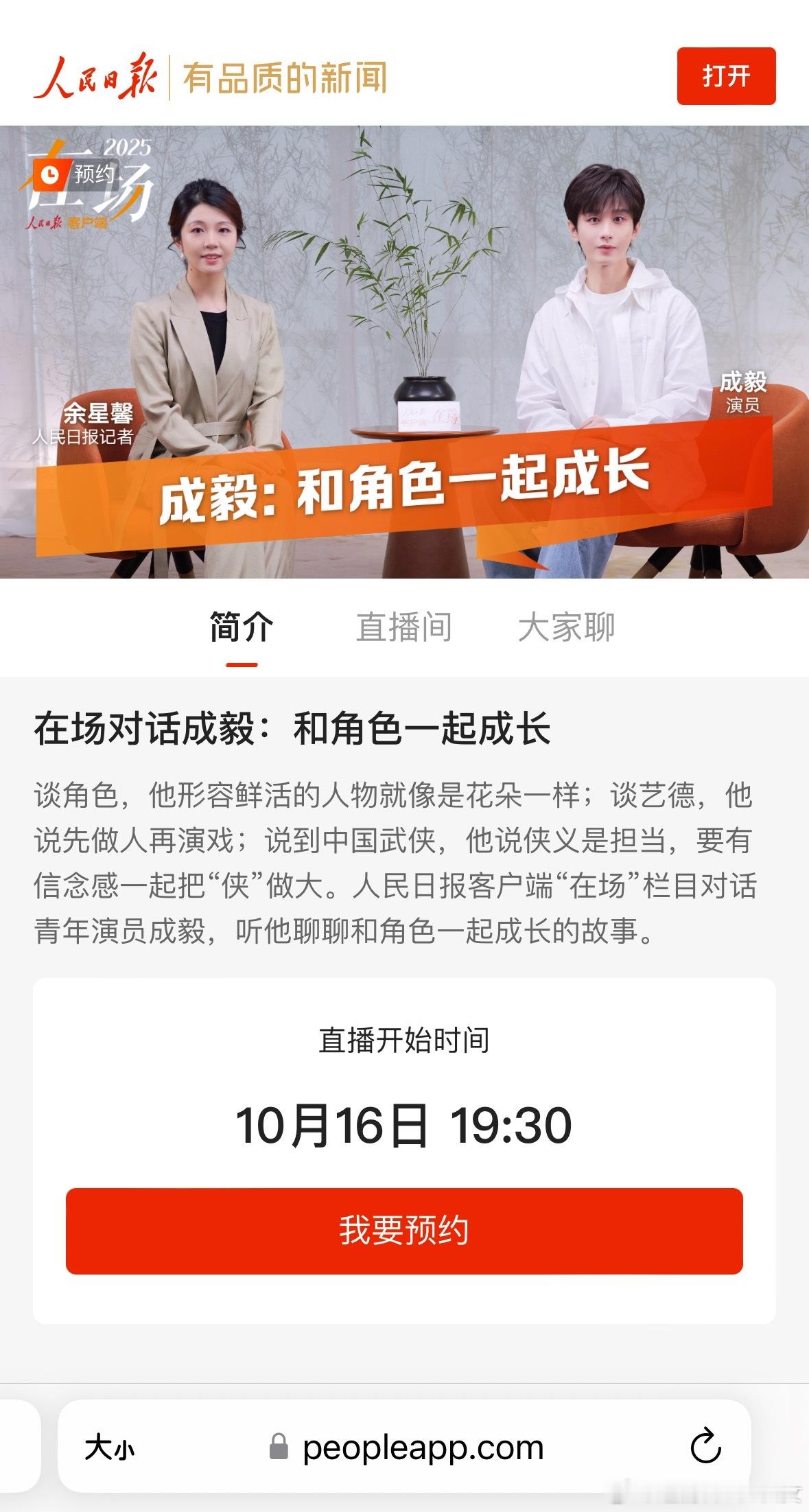 人民日报“在场栏目”对话成毅:和角色一起成长,谈角色谈艺德谈侠义,主流官方媒体认可的青年演员,10月16日晚上19点30分直播