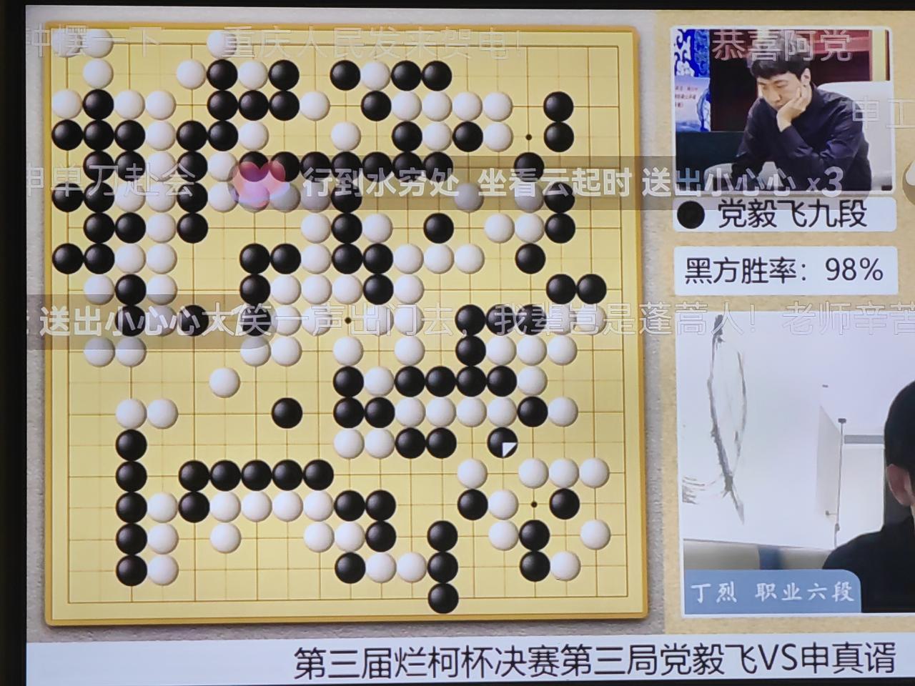 今天晚饭必须喝酒祝贺,对于爱好围棋的人来说,绝对兴奋的一件大事,烂柯杯三番棋第三局,党毅飞中盘战胜申真諝,以2:1夺得冠军,首先恭喜党毅飞,今天下午在丁烈的直播间看棋,这第三盘棋,与前两盘棋不一样,党毅飞几乎是全盘压制申真諝,没有给申真諝机会,每一手都下在正确的位置,不是一选就是二选,也没有像上两盘早早的没有了时间,两个人用时差不多,最精彩的一手就是冲了一手,然后搬住白棋,稳稳吃下中间两个白子,把胜率稳在了%98。同时也祝贺我的预测准确,用时没有超过5个小时。 走,买点猪头肉花生米,二两酒祝贺一下,这几天看棋看的我都累的不轻。丁烈多么希望晚上没课,好好庆贺一下,可惜,他必须有课。