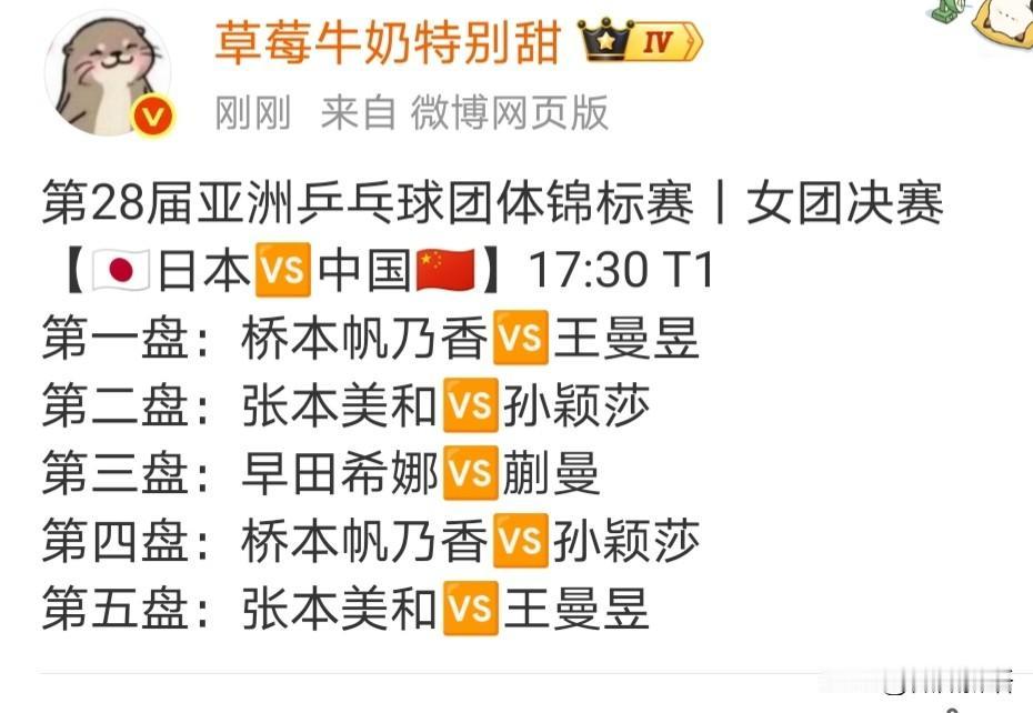 国乒女团决赛前热身开始了。 刚刚看到亚锦赛女团决赛的对阵表出来了,日乒抽到主场,派出桥本帆乃香打一单,张本美和打二单,早田希娜打三单。中国队是孙颖莎打一单,王曼昱打二单,蒯曼担任三单,一开始还以为会派王艺迪出战三单,没想到是蒯曼,估计国乒以为日乒三单会上大藤沙月吧。 看了一下蒯曼好像和早田希娜还没有交手过,也算是遭遇战了,两个人都是左手,不过这次国乒女队也带了左手陪练闫禹橦。今晚的第一盘比赛是桥本帆乃香对阵王曼昱,上次交手中王曼昱赢了桥本,王曼昱继续加油。 看到国乒女队也已经开始赛前热身了,莎莎穿着她的小红包头的袜子了,今晚应该是穿红色的比赛服。邱贻可教练又要带着女队比赛了,看大迪在那热身的时候很卖力,还以为大迪今晚继续上场呢,不管谁上场,我觉得大家都可以。莎莎和曼昱都赢过桥本帆乃香,对于削球我们还是有把握的,比赛很快就要开始了,大家加油!