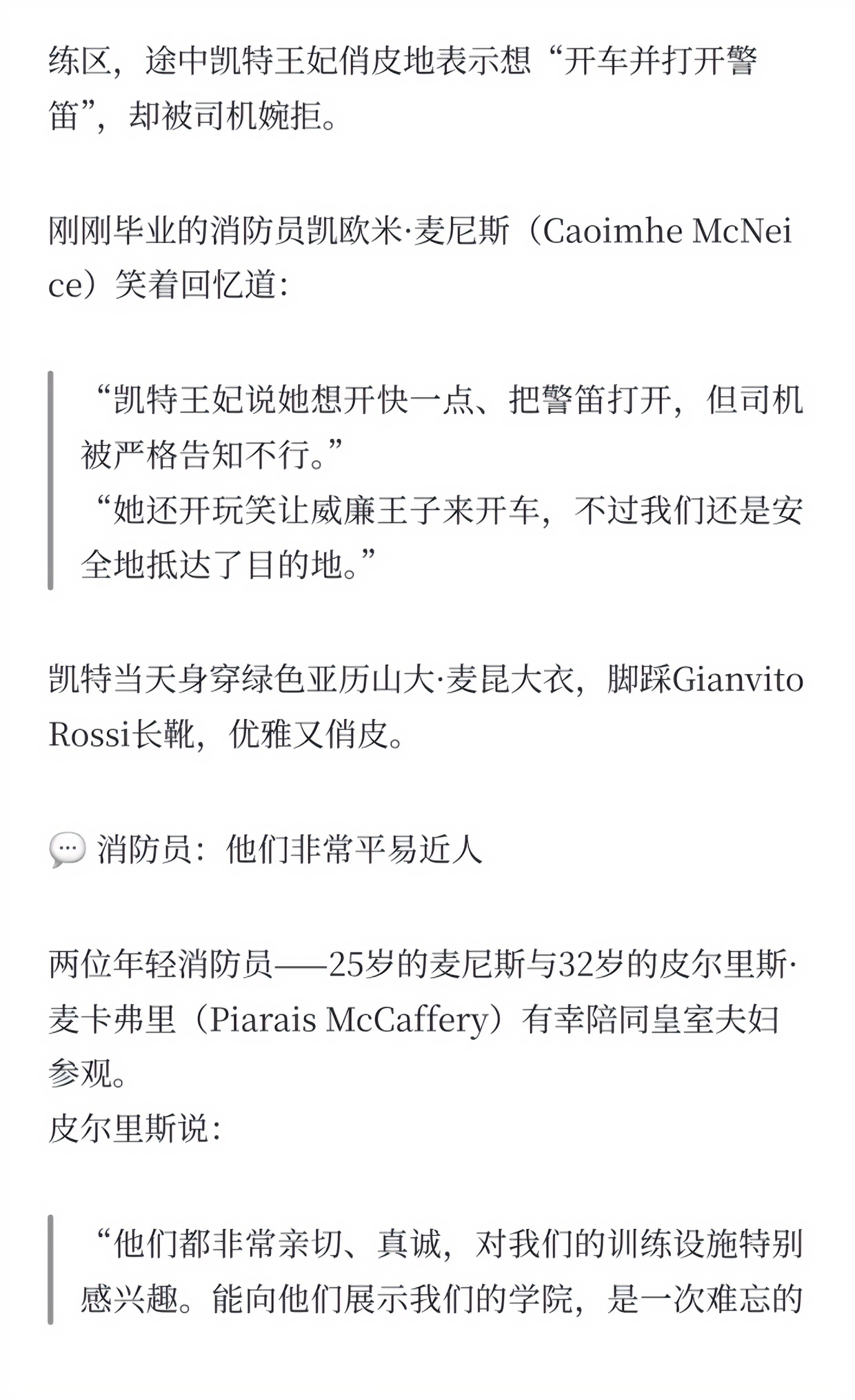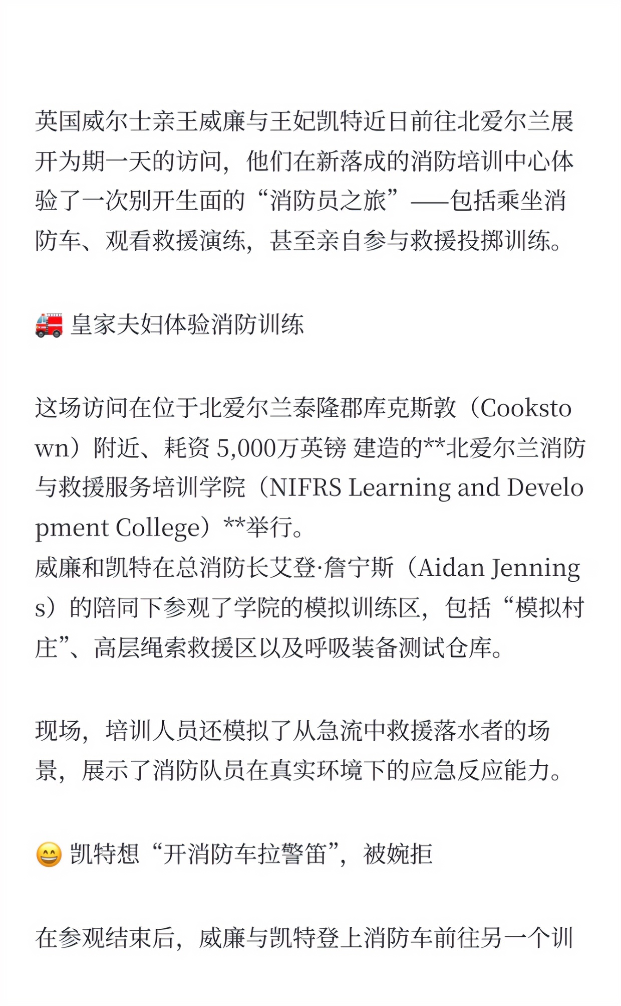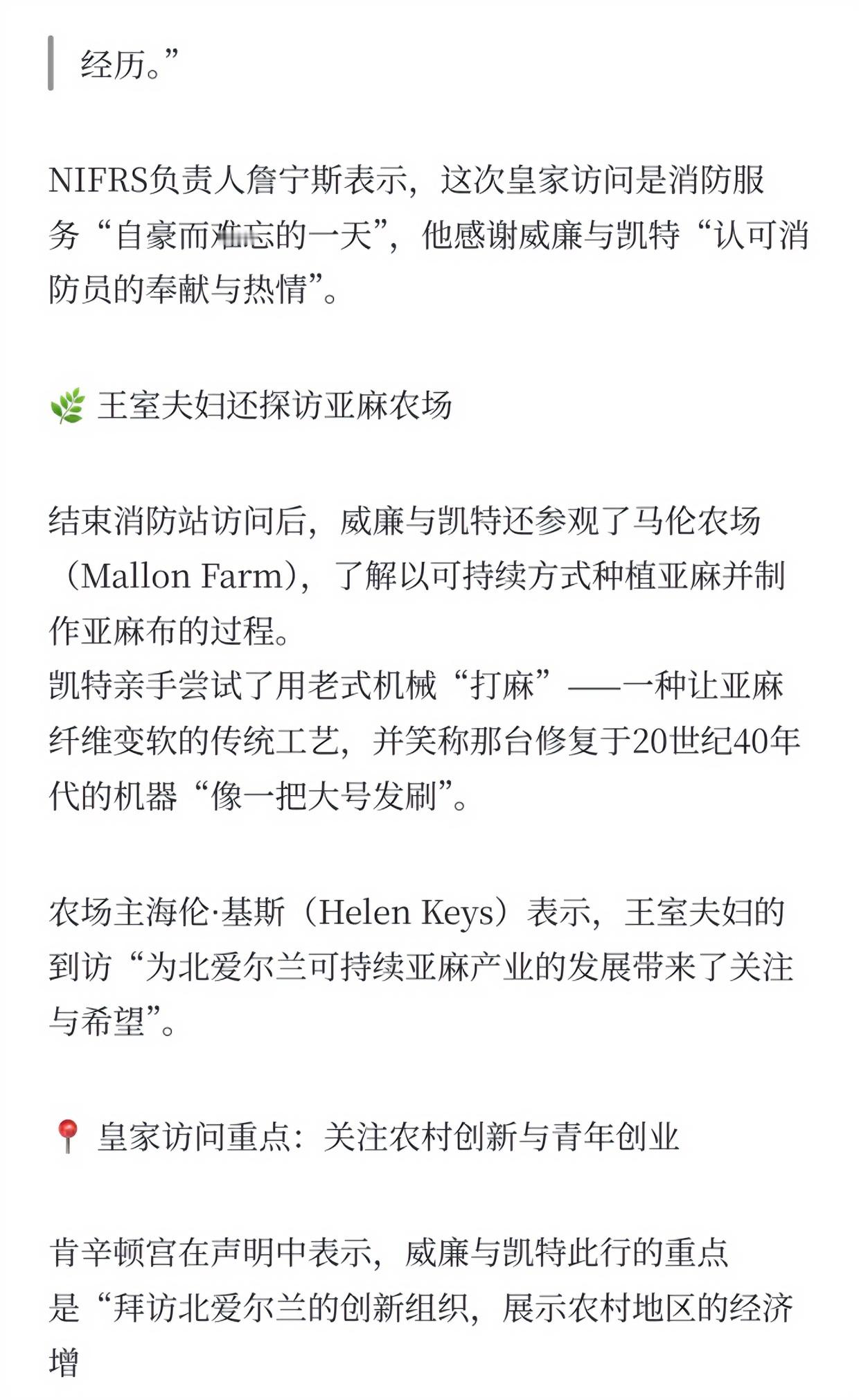 10月14日,威廉凯特对北爱尔兰进行了为期一天的访问,接连到访了NIFRS(北爱尔兰消防与救援培训学院)、Mallon Farm、Long Meadow Farm多地,以展现农村地区的经济增长以及发展潜力~