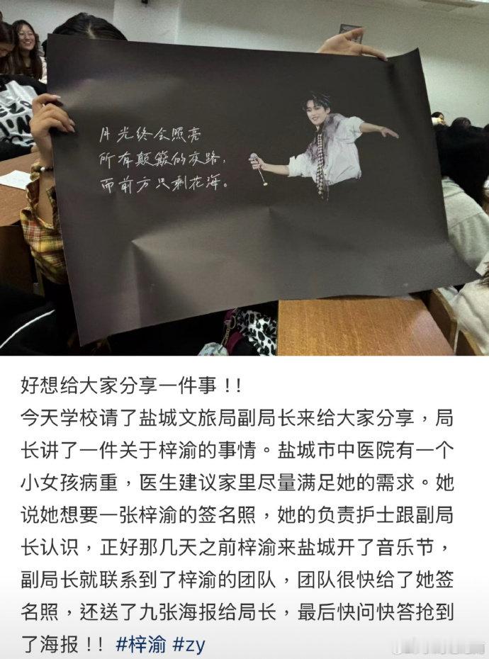 梓渝给病重女孩送签名照梓渝给病重女孩送签名照!还送了九张海报给盐城文旅局副局长,好善良的梓渝!希望这个小女孩收到签名照时可以高兴一点梓渝送病重女孩签名照