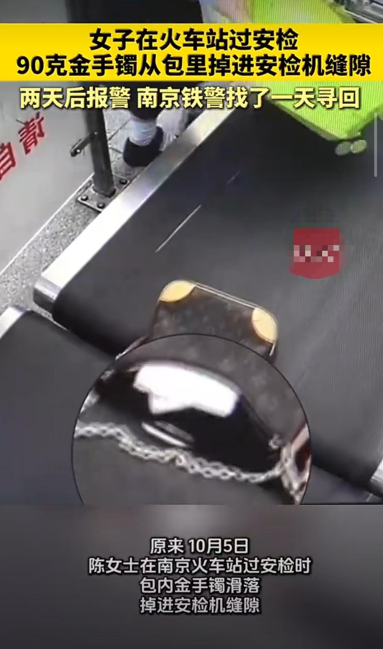 南京大姐安检丢 90 克金手镯,急疯了!48 小时后反转太暖心 南京的陈女士差点哭晕!10 月 5 号赶火车过安检,90 克的金手镯居然丢了,直到两天后才后知后觉报警。 这手镯分量不轻,按现在金价得值小四万,陈女士急得说话都打颤。民警一查监控,发现手镯从她没拉好拉链的包里滑出来,掉进了安检机传送带的缝里。 可等民警赶过去,缝里早空了。都过去 48 小时,火车站人来人往,找回来简直像大海捞针。 好在民警没放弃,拉着辅警连夜扒监控,一帧一帧地看,熬到凌晨两点,终于发现个保洁大姐捡走了手镯。 找到大姐时,她特坦然:“东西太贵重,当时问了没人要,就用手帕包好等着认领。” 当场就把手镯交了出来。 陈女士领回手镯时激动得直搓手,一个劲谢民警和保洁大姐。 大家要注意了,财不外露,警惕有心之人。