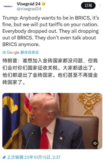 美国总统特朗普今天(北京时间10月15日)表示:“谁想加入金砖国家都没问题,但我们会对你们国家征收关税。大家都退出了。他们都退出了金砖国家。他们甚至不再提金砖国家了。” 特朗普这番话就是典型的“大话外交”,满是没根据的臆想,说白了就是拿关税大棒装样子,其实早就暴露了他对金砖机制崛起的战略焦虑。他说的“大家都退出了”“不再提金砖国家”,跟现实差得不是一点半点,稍微看看最近的国际动静就知道这话多站不住脚。 金砖机制哪儿是没人提,明明热度越来越高,扩容的步子根本停不下来。 2024年1月刚完成历史性扩员,沙特、埃及、阿联酋、伊朗、埃塞俄比亚正式加进来,成员国从5个变成10个,紧接着到2025年1月,又有印度尼西亚、马来西亚、泰国等9个国家成了金砖伙伴国,这哪儿是“都退出”,明明是排队往里挤。 就说巴西吧,2025年刚接了金砖轮值主席国的活儿,立马就公布了一堆合作重点,又是完善支付体系帮着促进贸易,又是推进人工智能治理,还打算借着联合国气候变化大会推动气候融资改革,忙得脚不沾地,怎么可能“不再提”? 2025年9月厦门刚办完金砖国家新工业革命伙伴关系论坛,一口气发布了12项成果,成立了工业能力中国中心,还搞了数字产业生态合作网络,71家海内外单位都抢着加入。 连缅甸、柬埔寨这些国家都主动加入《新型工业化国际合作倡议》,现在倡议成员都到19个了,这活跃度哪儿是“没人提”能形容的。 再说说特朗普嘴硬的“关税威胁”,这招早就不管用了,反而成了暴露美国霸权焦虑的笑话。2024年底他就放话,说金砖国家要是推进去美元化,就征收100%关税,结果呢? 金砖国家本币结算搞得风生水起,俄罗斯和金砖国家做贸易时,本币结算占比都到85%了,比两年前的26%翻了三倍多,人民币在俄罗斯进出口结算里占比都超过34%,美元的份额反倒降了。 今年美国对巴西输美产品加征关税,最高到50%,可巴西学者直接说了,这根本不是从商业角度考虑的,就是政治打压,反倒逼着巴西更看重金砖合作,要在制造业、高技术产业里找新的增长点。 更讽刺的是,这关税大棒最后砸的是美国人自己的饭碗。2025年美国对华大豆出口降了39%,农民损失了几十亿美元,加州葡萄酒出口跌了30%,威斯康星州有家啤酒厂因为成本涨了40%直接倒闭了。 政府只能拿纳税人的钱搞救助,可除了农民,其他受损的行业根本没人管,这不就是自己给自己制造麻烦吗? 金砖机制的吸引力早就藏不住了,不是特朗普一句大话就能抹掉的。现在金砖国家在全球经济里的分量越来越重,俄罗斯外贸里跟金砖国家的交易占比都快40%了,印度股市市值超3.3万亿美元,成了全球第五大股市,巴西靠服务业带动经济增长了2.9%,这些国家靠合作实实在在拿到了好处。 新开发银行更是给力,疫情期间给俄罗斯放了10亿美元抗疫贷款,平时还支持成员国搞基础设施和产业项目,这种实打实的合作,比美国的关税威胁管用多了。 连国际社会都看得明白,有网友直接说特朗普这招大错特错,美国嘴上说自由竞争,实际就是想控制别人,可金砖国家的金融实力和影响力就摆在那儿,靠恐吓根本挡不住。 说到底,特朗普就是看着金砖机制越来越受认可,自己国家的霸权地位不稳了,才拿关税当幌子说大话。现在全球都在搞合作共赢,金砖国家从贸易到科技,从金融到工业,合作的领域越扩越广,连人工智能培训都覆盖了57个国家的学员,这种开放包容的势头,哪儿是关税大棒能打退的? 美国要是真以为靠威胁就能阻止各国合作,那只能说明它对国际大势太糊涂,对自己的战略焦虑藏都藏不住。事实就摆在这儿,金砖国家不仅没散,反而越来越热闹,特朗普的“大话”再喊得响,也改变不了这个硬道理。