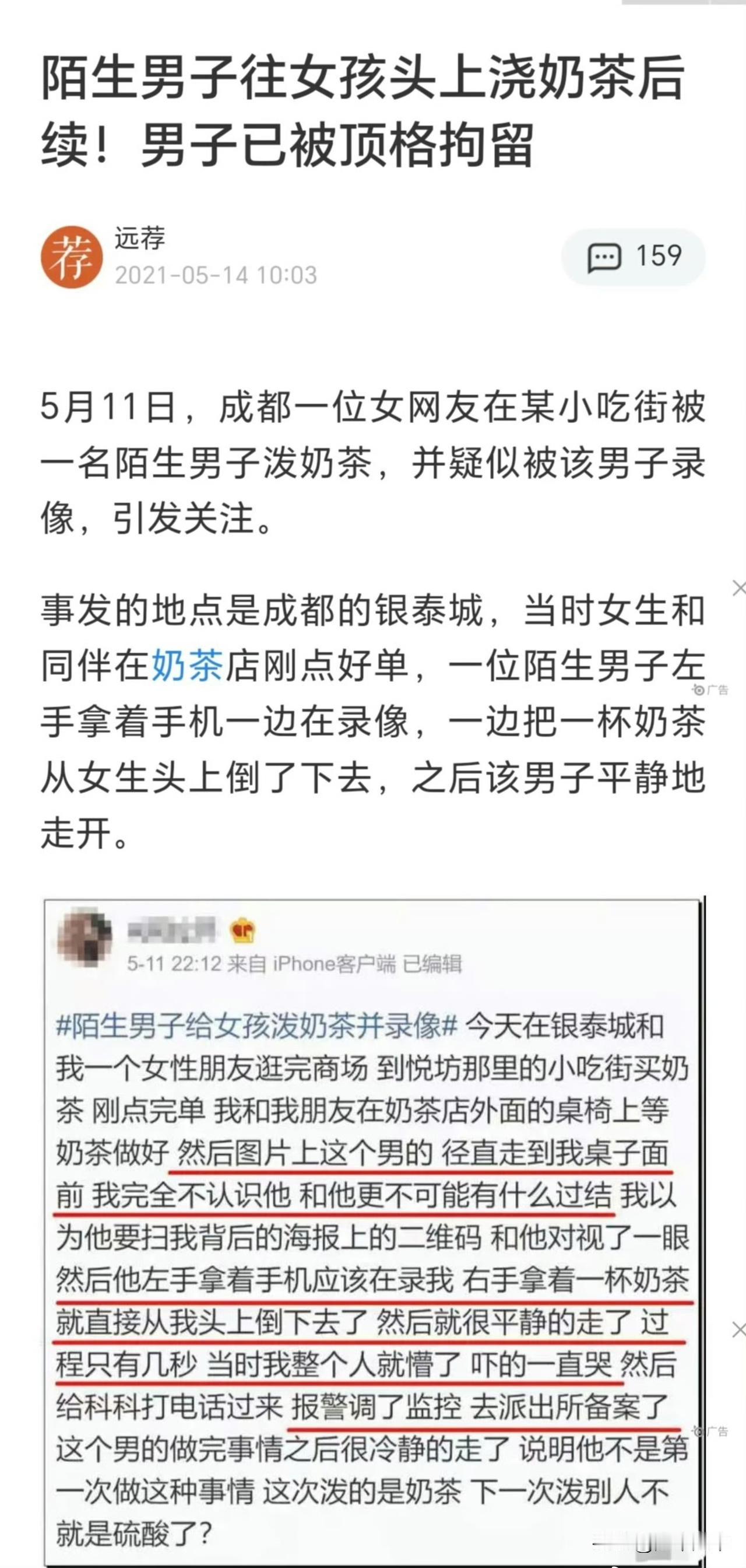 奇葩的巨婴行为。 在南京地铁鸡鸣寺事件后,10月7号在江苏的一奶茶店里一个刚从日本留学回国的女子,在提前打开店门预留好逃跑路线,突然将整杯冰奶茶泼向陌生戴帽女生头部,泼洒后迅速逃离。她这样做的缘由是误以为被泼女子与朋友闲聊的在指桑骂槐说自己,便将一杯奶茶倒在对方头上。受害者同伴立即追上阻拦并报警,施暴者拒绝道歉,居然提议“对方泼回即可扯平”😄 后在施暴者母亲出面下给予赔偿才调和事件,受害者未追究法律责任。 一名留学生居然在没有任何证据的情况下,就凭自己的主观臆测对方指桑骂槐议论自己后就公然施暴。她是在国外没有接受过社会的毒打,还是我们国家对这样做的人保护得太好了?要知道我们的法律对于这样的行为可以认定为寻衅滋事罪,向陌生人泼洒液体属“无事生非、破坏公共秩序”,可处5-10日拘留的哦。 21年的时候成都男子向陌生女子泼奶茶,事后是被行政拘留的了。最让人纠结的是执法尺度的问题?同样是泼饮品,有的被拘留,有的赔钱和解。这才让人困惑到底啥行为算是寻衅滋事,啥行为只是小冲突?判罚标准不明确,既没法警示其他人,也容易让更多的人觉得“泼了也没事”大不了事后赔钱了事。 我不会做她的心理推测,但根据法律来说,其行为已经明确触碰了寻衅滋事的法律红线。根据两高司法解释,为发泄情绪无事生非、在公共场所实施侵扰行为,即便未造成严重人身伤害,仍可能构成行政违法 。若涉事奶茶为热饮,更可能因存在烫伤风险升级为故意伤害 。而“你也泼我一杯扯平”的荒诞提议,是对被害人的二次侵犯,暴露其对法律规定侵权责任的彻底认知缺失。母亲代为赔偿达成的和解,看似了结了纠纷,实则制造了社会上责任真空,成年人的行为后果理应由自身承担。唯有让违法必究,才会让这样的“以暴制暴”的事情不会在生活中重复发生。 鸡鸣寺地铁事件