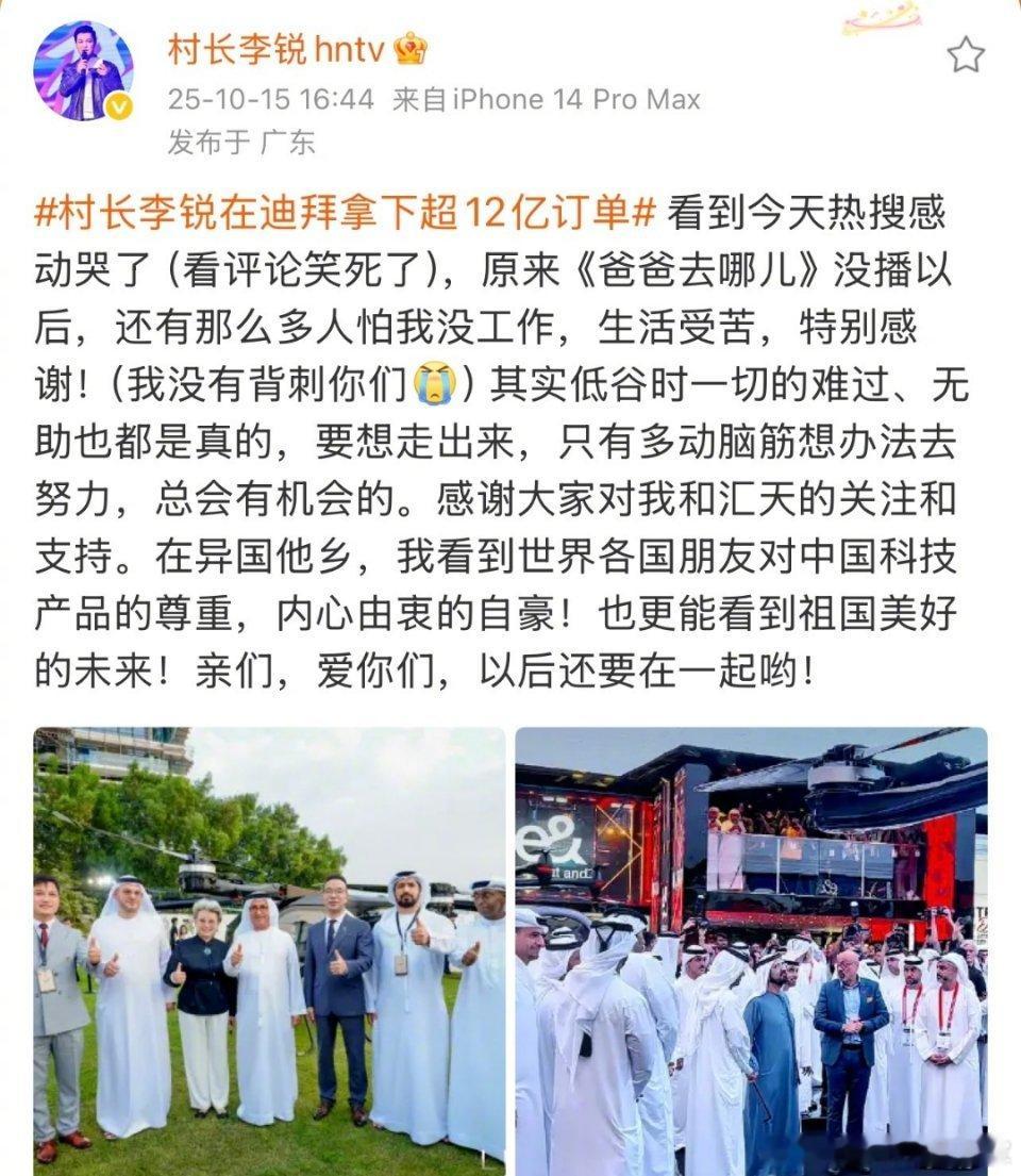 《爸爸去哪儿》完了就说怎么没看见村长在娱乐圈活动了,哈哈哈好一个隐.藏.大.佬,村长的“村”原来是地球村!村长李锐在迪拜拿下超12亿订单
