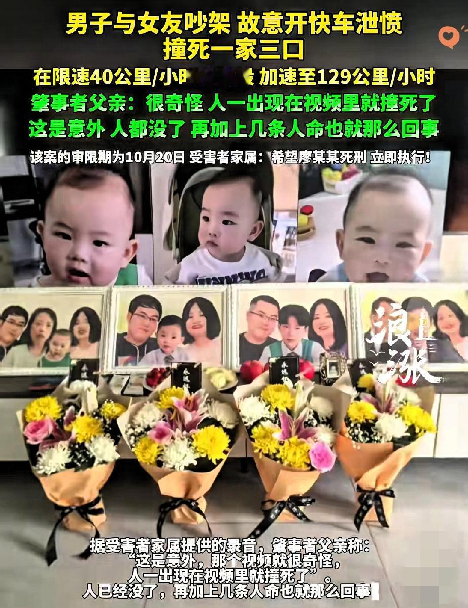 和女友拌嘴就把车飙到129码,闹市区撞死一家三口,这司机的心是铁做的? 更寒心的是他爹那句“人没了,揪着我儿子没用”,简直刷新底线! 20岁的廖某就因为这点破事,把限速40的路当成泄愤赛道,撞得不满周岁的宝宝当场没了,年轻父母也没救活。 他自己倒好,撞完还淡定抽烟,半分愧疚没有。 他爹更离谱,不道歉就算了,还拿80万想买谅解书,被拒后就撒泼,说这是“意外”,甚至甩锅受害者站错位置。 这哪是意外?分明是骨子里没把别人的命当回事,连带着家庭教育都透着冷血。 检方改成以危险方法危害公共安全罪批捕,就该让这种人知道,情绪失控不是借口,漠视生命就得付代价。 眼看审限要到了,你觉得法律该怎么判才能告慰逝者? 这种冷血家属该不该被追责?来聊聊~