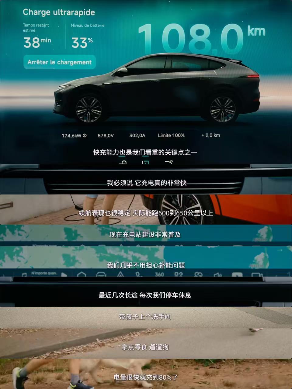 在法国旅行,只要带孩子上个洗手间、买点零食、遛遛狗,车就能充到80%,再也不用担心续航。