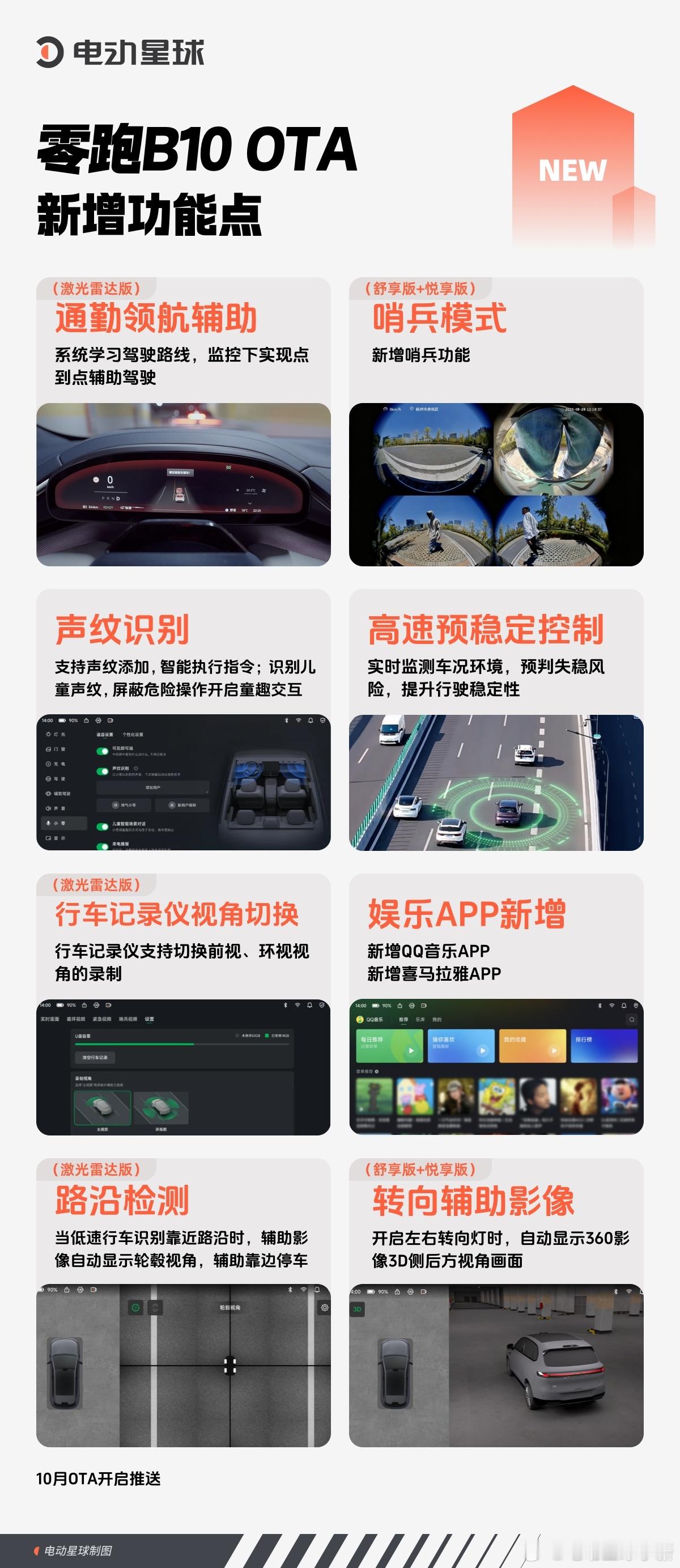 就在前几天,零跑 B10 进行了一次 OTA 升级!这次更新涵盖驾驶辅助、泊车体验、人机交互、安全防护等多个维度,除了新增的通勤领航功能外,哨兵模式、转向辅助两个非常实用的功能也来了,QQ 音乐、喜马拉雅也是终于加上了,接下来一起看看这次升级的核心亮点[不愧是你]