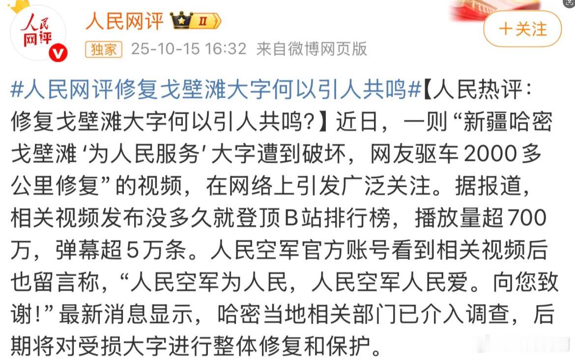 人民网评修复戈壁滩大字何以引人共鸣 网友驱车千里修复戈壁滩大字,27车20吨砂石凝聚敬畏,用行动传承革命精神,这种对集体记忆的守护,引发了大众内心深处的强烈共鸣。