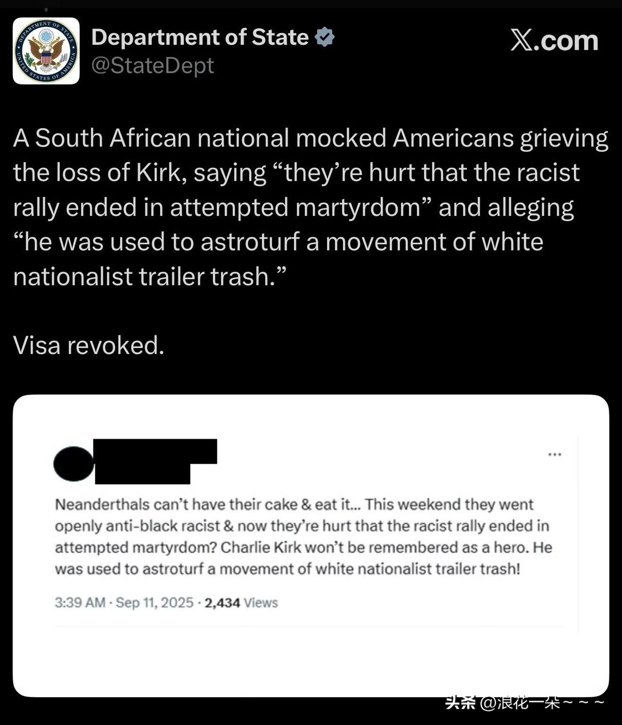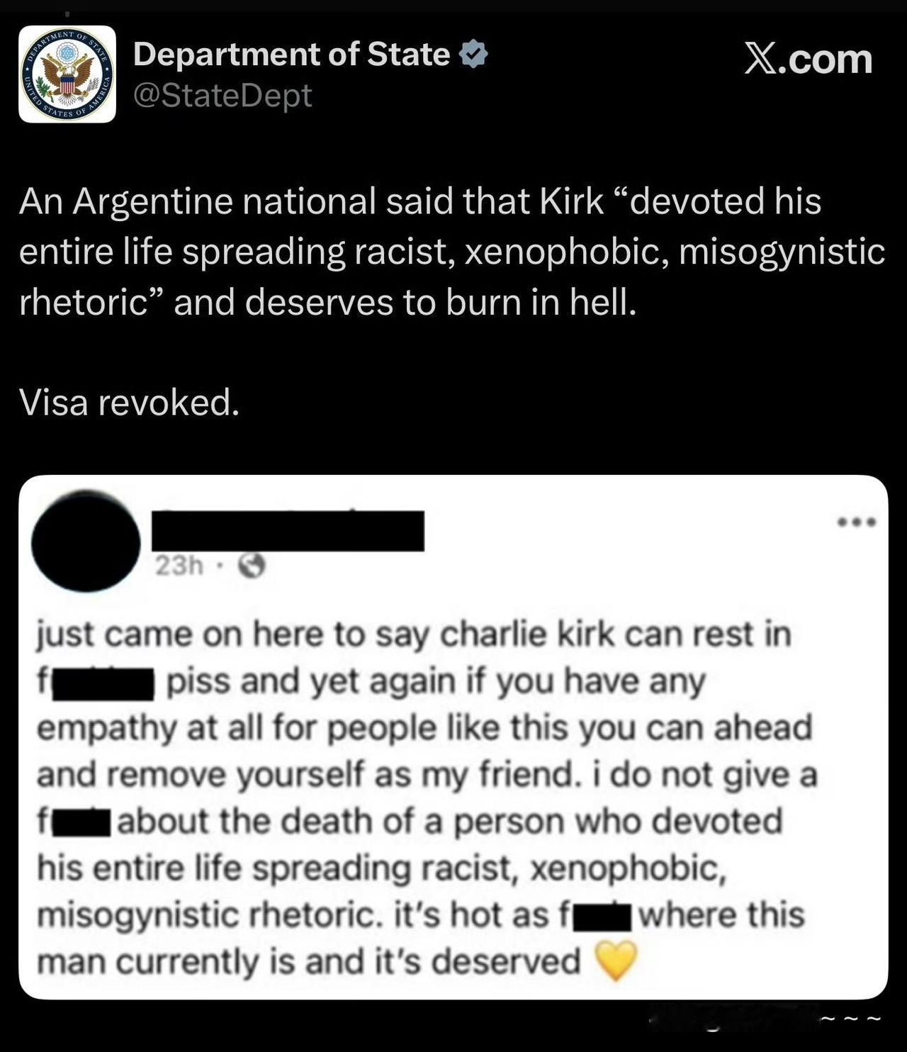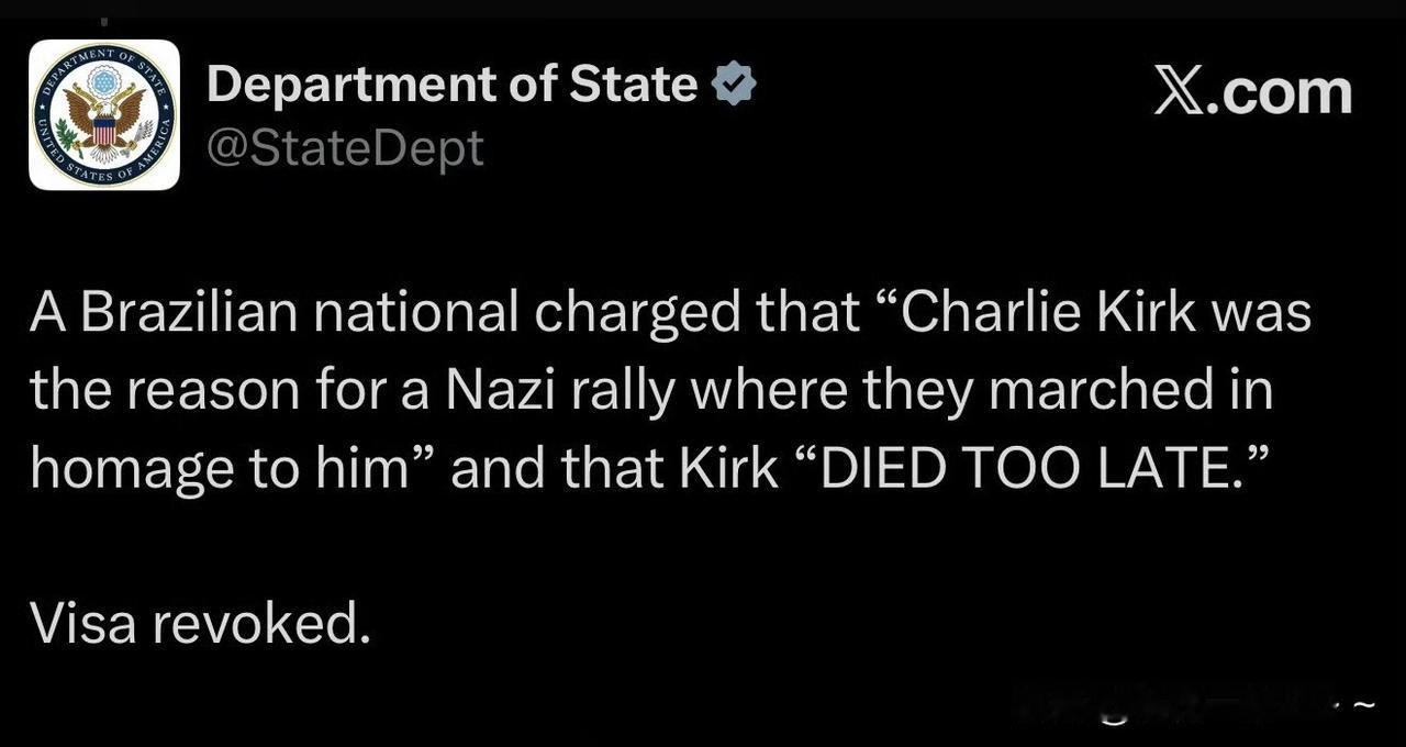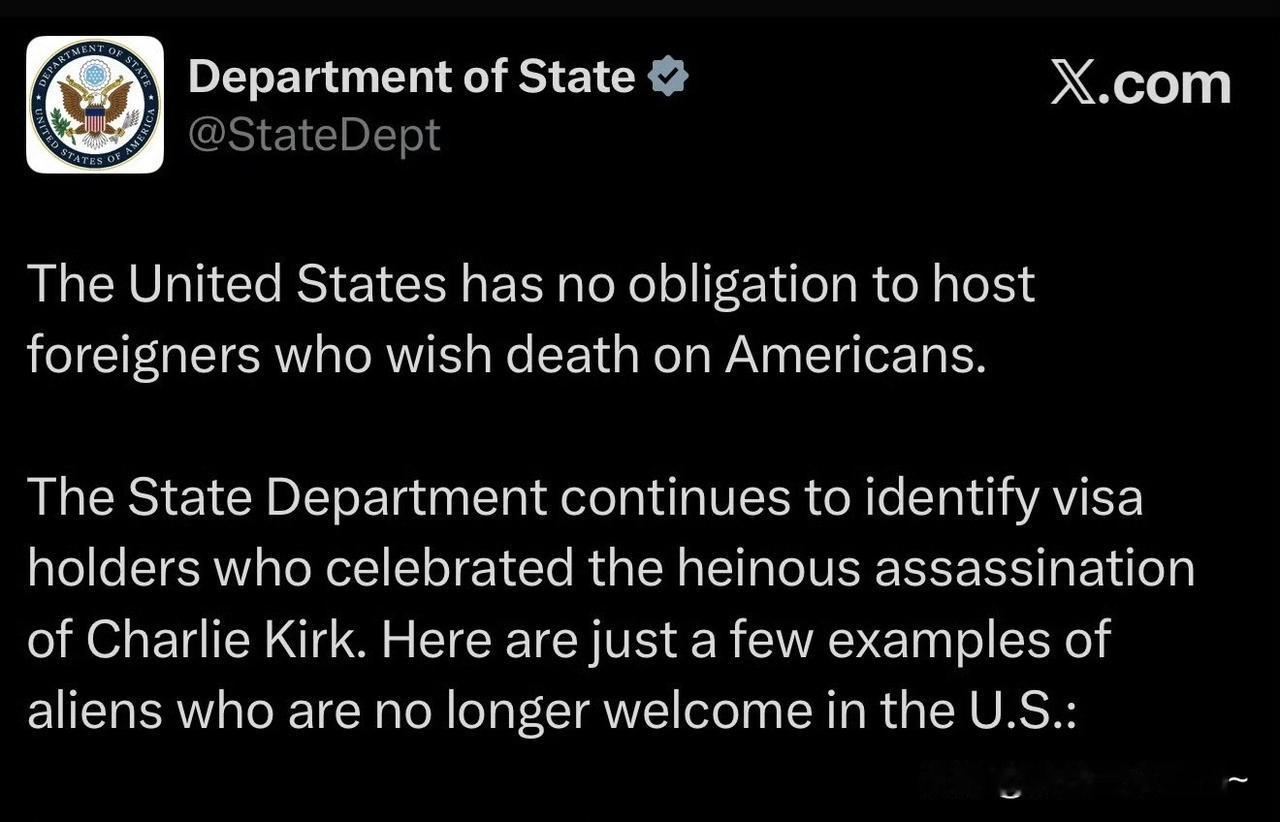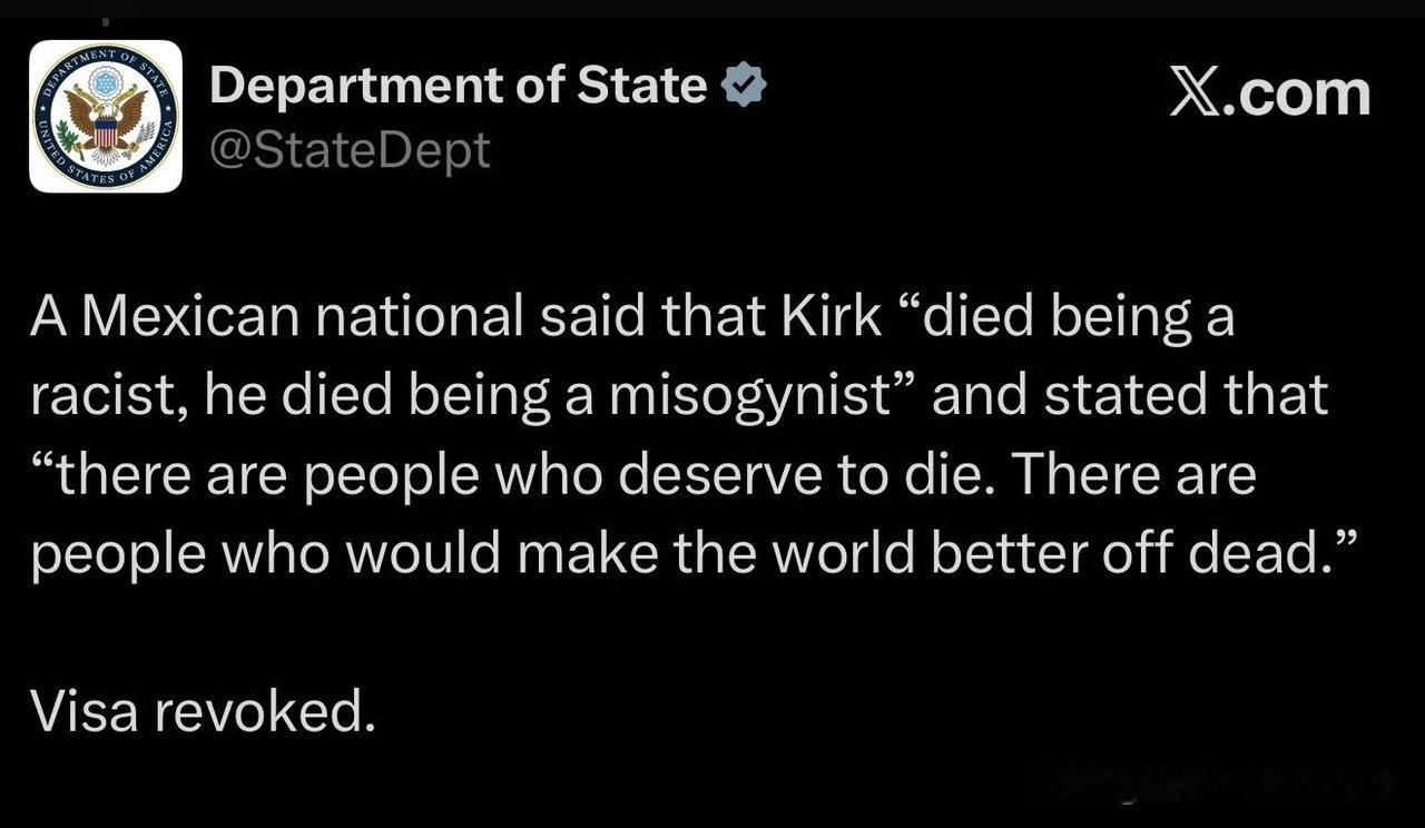美国国务院发文: “美国没有义务接纳那些诅咒美国人去死的外国人。” 美国一下子撤销了6个人的签证。 他们分别来自于6个不同的国家,分别是巴西,墨西哥,德国,南非,巴拉圭和阿根廷。 原因也都很清楚了,就是他们在网上发布污蔑特朗普政治盟友查理柯克的不当言论。 所以说,在美国,网上管控也很严。并不是大家想象的言论自由,特别是针对一些外国人! 希望在美国的外国人,在网上多说一些他们爱听的,好听的,赞扬他们的话,可别诅咒他们了…[捂脸]再严重一点的话,把你们的财产都给你没收了怎么办?