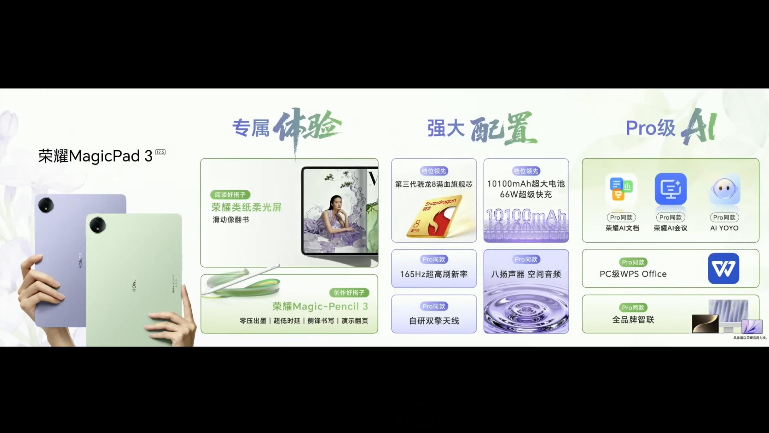 荣耀 MagicPad 3 12.5 发布(CGL-W00/W10),8+256GB 售价 2699 元、12+256GB 售价 2999 元、柔光版 8+256GB 售价 2999 元。