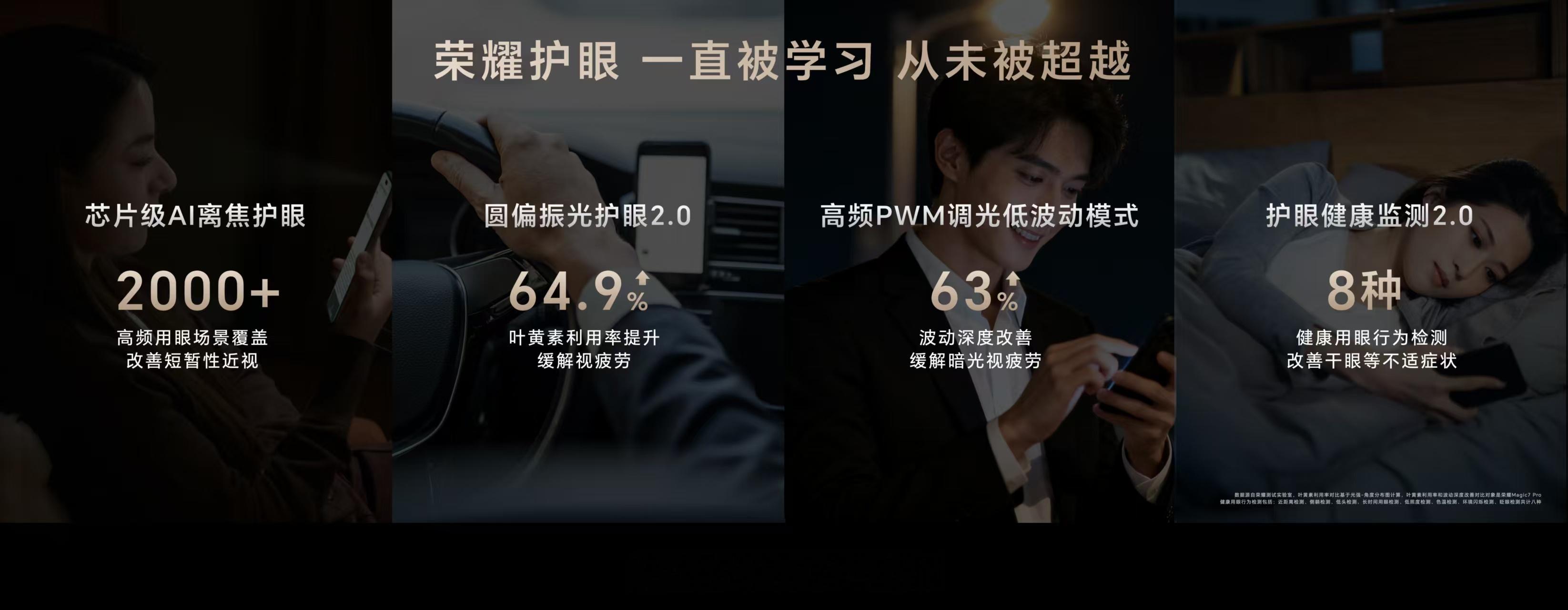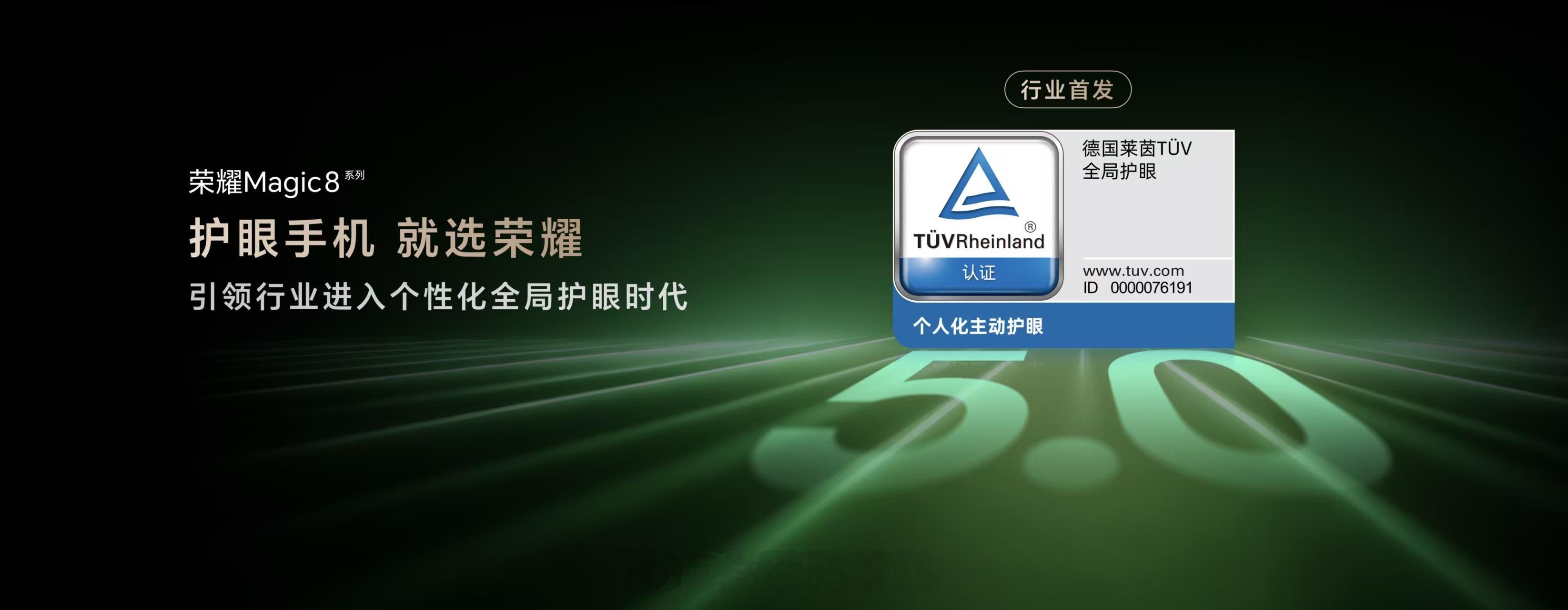 荣耀Magic8 系列行业首发莱茵TÜV全局护眼5.0认证,引领个性化全局护眼新时代。