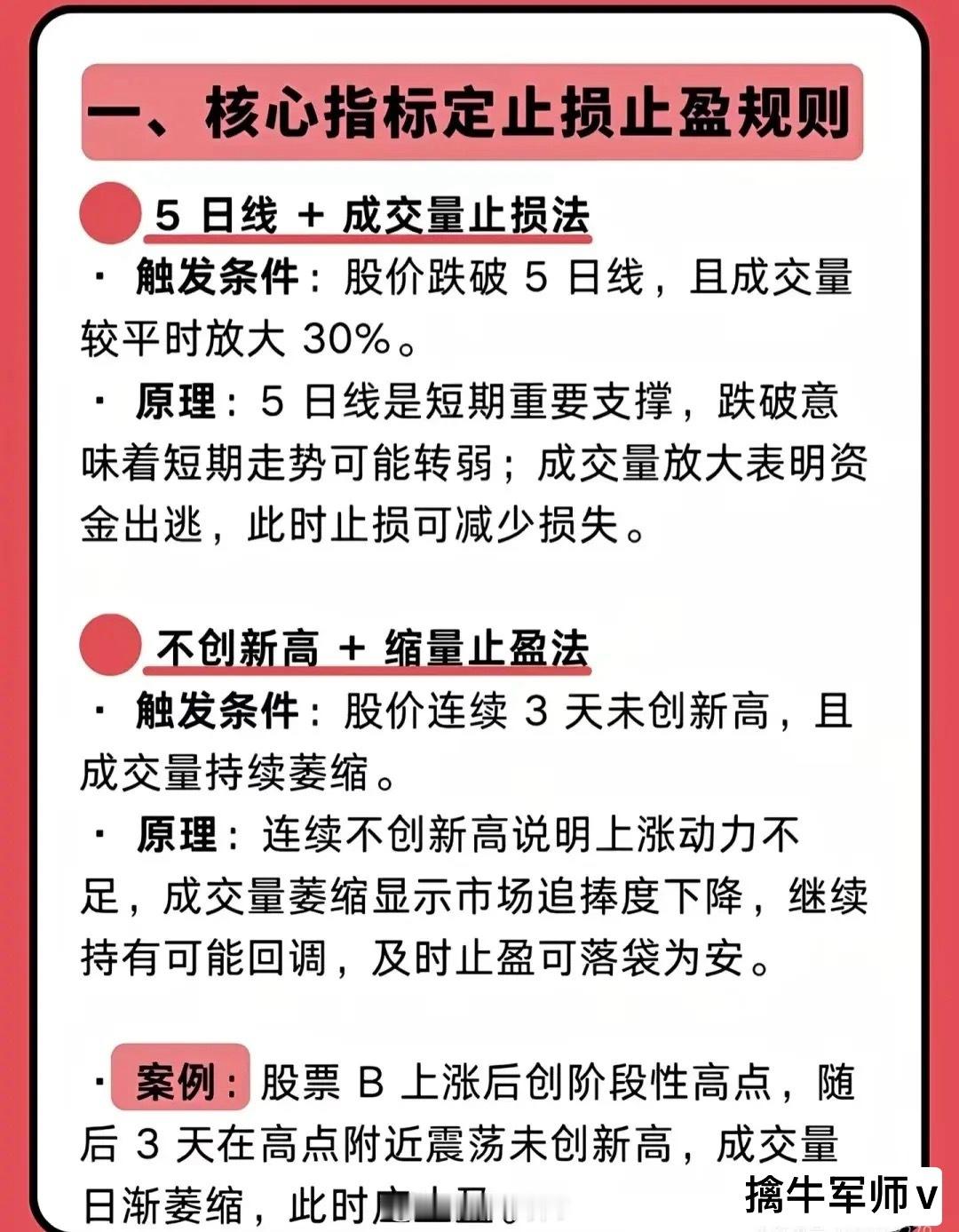 - 5日线+放量法:股价跌破5日线且成交量放大30%时止损(短期支撑破位+资金出逃信号)。
