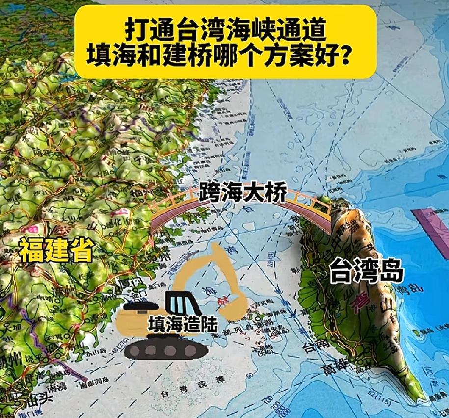 台湾海峡只有60米深,长约 200 公里,宽约 180 公里,土方量 200000×180000x60,江西、福建、浙江、广东500米高的山非常多,平均每个省移10座500米高的山过去就够填。 况且180公里也不需要全填,可以填10公里宽,10公里宽的陆地可以隔开海。 填海造陆只需要1万亿人民币,而建跨海大桥1万亿还不够。