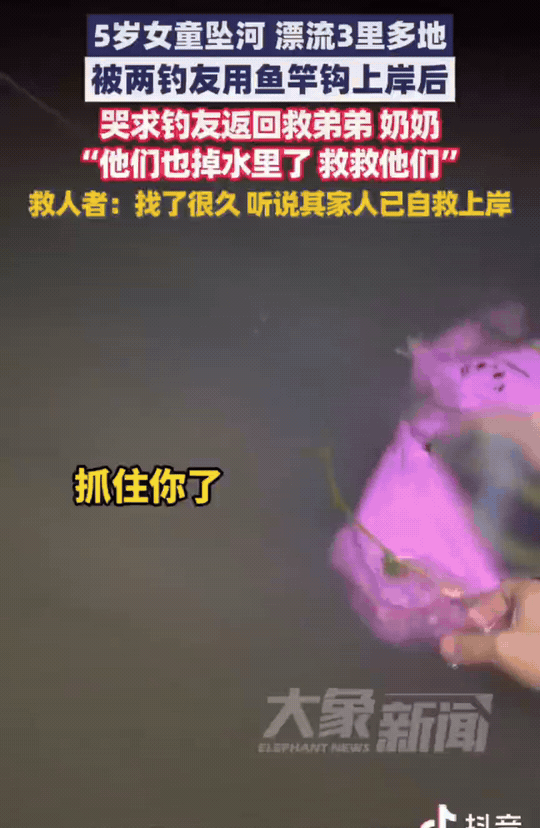 泪目!河南邓州,晚上7点多,5岁小女孩掉进河里,漂了3里地。被救上岸,第一句话就是求人救她的奶奶和弟弟。 5岁小女孩和爷爷奶奶弟弟一起过河,过桥的时候4人一起掉进了河里。小女孩漂了3里地,被在河边钓鱼的两个大哥发现了。钓鱼大哥用鱼钩勾住了她的衣服,把她拉上岸。 上岸后,小女孩说,还有她奶奶和弟弟掉河里呢。钓鱼大哥赶紧报了警。其实,小女孩的爷爷奶奶和弟弟,在当时掉下去的地方就自行上岸了。 这个小女孩真是不简单,自己晚上掉河里了,一点没有被吓住。还知道救奶奶和弟弟。虽然她也哭了,但是还是很冷静的。 网友的评论都炸锅了,都希望有一个这样懂事的小女孩。 在这种危机时刻,才5岁的孩子,能第一时间想到奶奶和弟弟,确实是很值得点赞的。也为救人的两位大哥点赞👍!