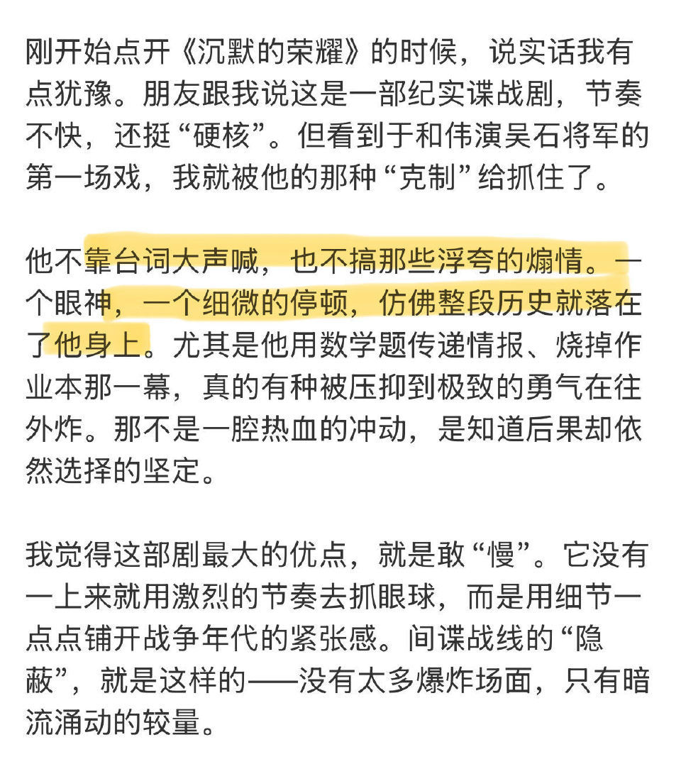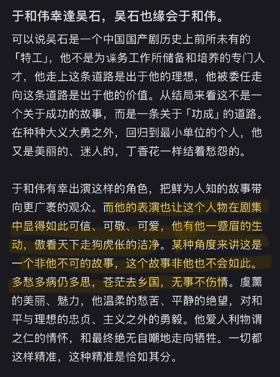 于和伟演技这块还是太权威了 从文人雅士到铁血刑警,从隐秘战线的将军到市井小民,于和伟演什么就是什么!每个角色都是“剧抛脸”级别的演绎,有他坐镇的戏,质量直接盖章认证。这演技,不愧是内行走的教科书!