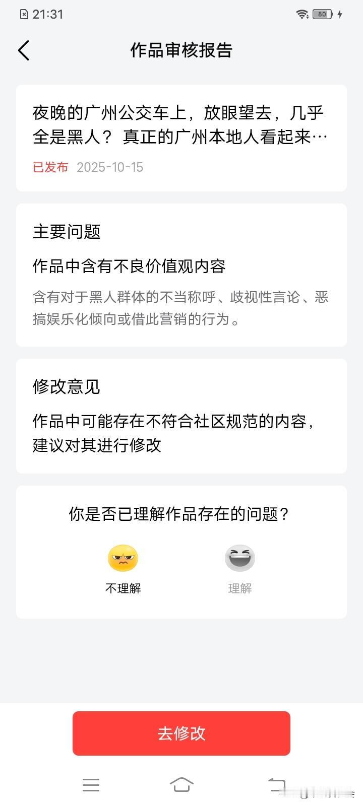 转发一个广州黑人乘坐公交车的微头条。 马上就收到了平台的警告限流通知! 说我宣扬不良价值观?歧视黑人? 文中没有任何歧视黑人的言论! 严格按照平台规则发文,根本就不违规! 向平台提供了原作者的视频截图和视频链接,结果依然申诉失败? 有这样奇葩的网络平台,真是太令人寒心了!外国黑人