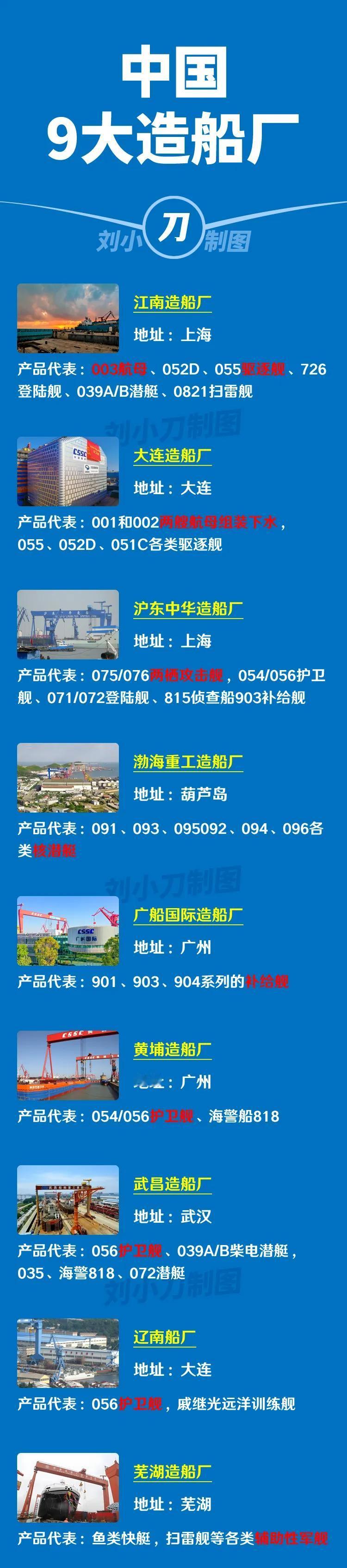 我国哪些船厂可以造航母? 从下图可以看到我国拥有九大造船厂,其中历史最悠久的是江南造船厂,前身可以追溯到清政府创办的江南制造总局。 而能够造航母的,就由江南造船厂和大连造船厂。 其中前两艘航母辽宁舰和山东舰,都是在大连造船厂改装和建造的,而第三艘航母福建舰则是在江南造船厂制造的,而且福建舰从开工到下水只用了4年,创造了航母建造的新速度。 希望这两艘造船厂可以造出越来越多的先进航母,成为我们傲立于世界民族之林的脊梁。