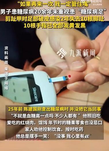 “可惜没有后悔药!”14日报道,浙江一男子剪脚指甲,不慎剪破拇趾边缘,出血并不多,他贴了一张创可贴就没再管了,可过了几天,伤口不仅没愈合 ,开始红肿、发痛走路也磨得难受。 后来竟磨出一个水疱,破了之后一直流脓液,一个月了也不见好,最后导致10根脚趾被全部切除! 10月,浙江陈先生坐在轮椅上,目光落在自己空荡荡的脚趾部位。他手里捏着一张皱巴巴的旧创可贴,指尖微微发抖 —— 就是这东西,曾贴住他拇趾的小伤口。 没人能想到,这个看似不起眼的小伤口,最后让他失去了十根脚趾。他叹了口气,翻出手机里以前穿皮鞋的照片,眼眶慢慢红了。 时间回到去年春天,陈先生在家剪脚趾甲,不小心剪破了拇趾边缘。出血量很少,他顺手从抽屉里拿了张创可贴贴上,没当回事。 那天晚上,他还像往常一样,吃了大半盘红烧肉,配着一瓶甜饮料。家人劝他:“你有糖尿病,少吃点甜的,伤口也得注意。” 他摆摆手:“小口子没事,血糖高点不碍事,我身体好着呢。” 过了三天,陈先生感觉贴创可贴的地方有点痒,还隐隐发痛。他拆开创可贴一看,伤口周围红了一圈,走路时磨得更难受。 可他还是没去医院,找了点家里的碘伏擦了擦,又换了张新创可贴。其实那时他的脚已经有点麻了 —— 前阵子走路时踩过钉子,都没觉得疼。 只是他没把脚麻和糖尿病联系起来,觉得 “可能是走路多了累的”。又过了一周,陈先生的拇趾开始肿起来,还起了个水疱。 水疱破了之后,流出黄色的脓液,闻着还有点异味。他这才有点慌,想去医院,可刚好赶上公司加班,就又拖了几天。 等他终于去医院时,右脚已经肿得像个馒头,大拇趾皮肤发紫发黑。医生检查后皱着眉说:“糖尿病足感染,得赶紧手术截掉坏死的部分。” 第一次手术截掉了他的右脚大拇趾,术后医生反复叮嘱:“一定要控制血糖,按时吃药,注意足部护理。”陈先生嘴上答应,可回家后还是管不住嘴,偷偷吃甜食,药也偶尔忘了吃。 他觉得 “少吃一次药没事,少测一次血糖也不影响”。两个月后,他发现右脚相邻的脚趾也开始发黑,还伴着溃烂。 再次去医院时,医生无奈地说:“感染扩散了,只能再截。”接下来的两年里,陈先生的足部感染反复发作,先后做了五次手术。 每次手术,都要截掉一部分坏死的脚趾,直到最后,十根脚趾全没了。现在他只能靠轮椅出行,以前能轻松爬的楼梯,现在想都不敢想。 他终于后悔了,每天按时吃药,严格控制饮食,可一切都晚了。有次他在医院遇到同病房的糖友,对方说:“我每天检查脚,控糖也严格,现在脚好好的。” 如今,陈先生每天都会用温水洗脚,水温控制在 37 度以下,洗完用软毛巾擦干脚趾缝。他还特意买了宽松的纯棉袜子和透气的布鞋,穿之前都会检查鞋里有没有异物。 家人也帮着他一起管理血糖,每天提醒他吃药、测血糖,监督他的饮食。他常跟身边的糖友说:“千万别学我,小伤口也得重视,血糖一定要控制好。” 只是每当看到别人正常走路的样子,他还是会想起自己曾经健康的双脚,心里满是遗憾。 他现在最大的愿望,就是能通过康复训练,慢慢脱离轮椅,拄着拐杖走路。这个小小的愿望,成了他每天坚持控糖、护理足部的动力。 信源:九派新闻 “如果再来一次我一定管住嘴” 男子患糖尿病20余年未重视患“糖尿病足” 剪趾甲时足部破皮感染2年失去10根脚趾 10根手指已全部发黄发黑