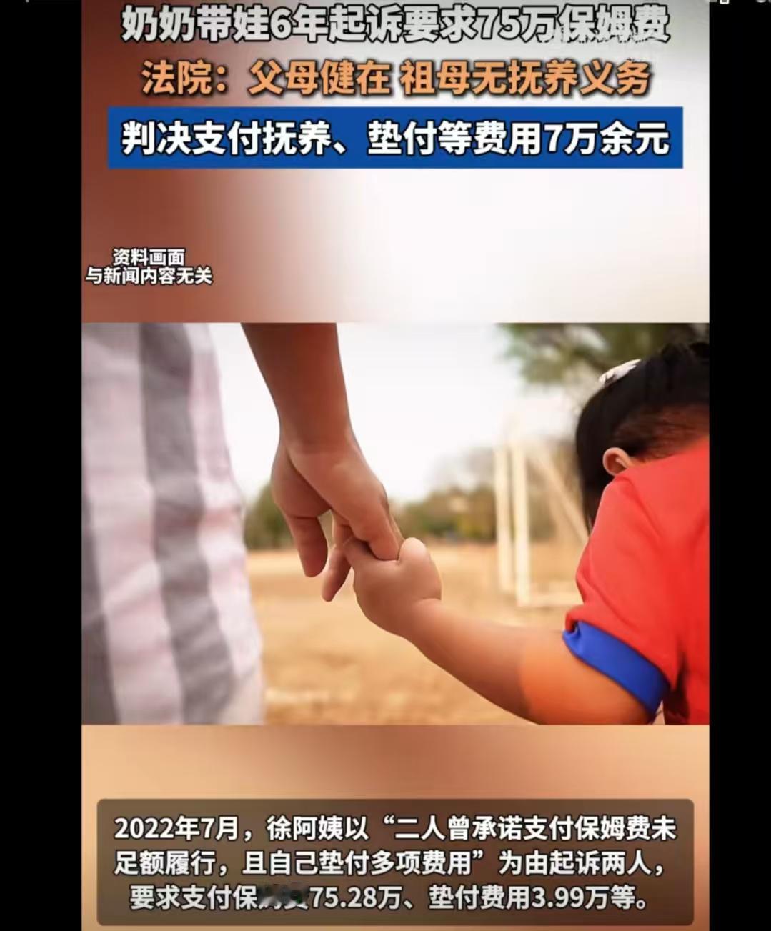 奶奶带娃6年要75万保姆费!法院判完,全小区都吵翻了 新疆徐阿姨的事儿太戳心了!孙女出生后,她辞了工作专职带娃6年,深夜哄睡、通宵守着发烧的孩子全干过。 当初儿子承诺每月给8000元,结果没兑现,她一气之下告上法庭要75万。前儿媳却喊冤:房租、兴趣班都是我们掏钱。 法院最后只判了7万多,说亲情不能按生意算,但也得补老人的实在付出。徐阿姨拿着钱哭了,说心疼的是真心换不来一句辛苦。 现在隔代带娃太常见,可这亲情账到底该怎么算?提前说好钱俗不俗,不说又怕寒了老人的心?