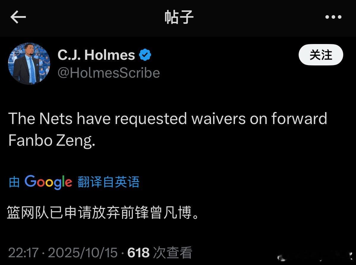 美国媒体报道,曾凡博被NBA球队篮网队裁掉!