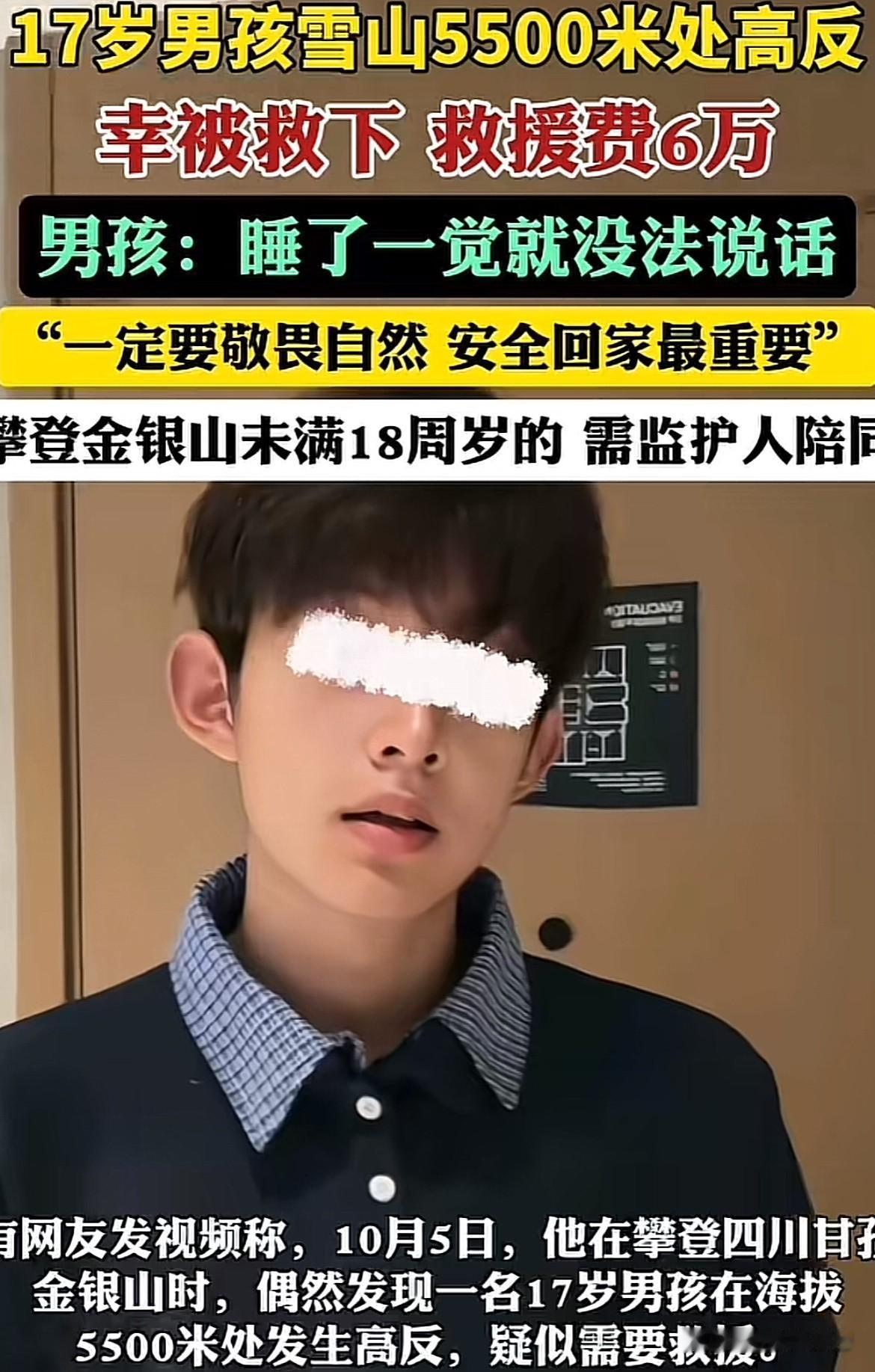 17岁男孩雪山高反获救:别让青春冒险成生命豪赌! 这男孩本以为凭过往高海拔徒步经验就能征服雪山,却在睡一觉后连话都说不出,最终花6万救援费才捡回条命。更该警醒的是,他未满18岁独自登山,明显违反了金银山登山需监护人陪同的规定。 别让对自然的无知敬畏,把青春冒险变成生命豪赌!登山不是逞能的舞台,尤其是未成年人,没有监护人把关、没有足够应急准备,那所谓的“挑战自我”就是拿命开玩笑。 你觉得年轻人追求极限运动,是该尽情释放还是谨慎为先?来聊聊你的看法~