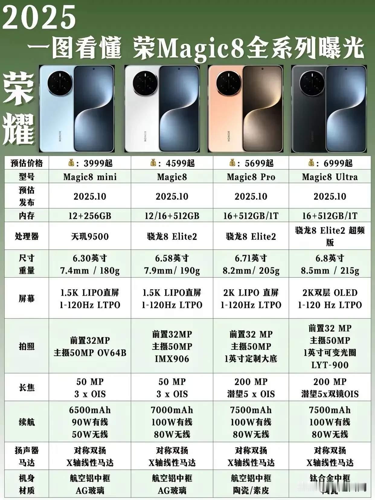 荣耀Magic8系列汇总,整体来说提升最大的除了芯片就是电池,影像方面基本没有大