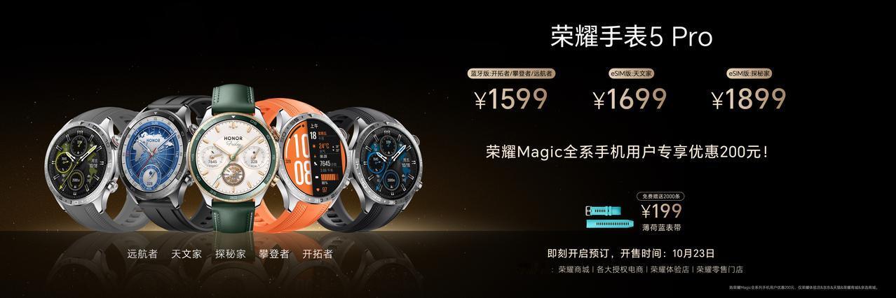 荣耀Magic8系列正式发布: 荣耀Magic8系列搭载全新MagicOS 10,YOYO能够学习用户使用习惯,在真实场景中不断成长,持续自进化。AI键一键长按启动YOYO看见和YOYO执行,可与 iPhone 设备的信息互通互联,一键自动领券优惠购物。全系搭载第五代骁龙8至尊版,兼容100W PPS协议,搭载全新绿洲护眼屏,峰值亮度6000nits,最低亮度1nit,标配巨犀玻璃,支持IP68、IP69、IP69K,开放音腔+双1216扬声器,前置5000 万像素。 荣耀Magic8 Pro为6.71 英寸 OLED 等深四微曲屏,有旭日金砂、天青色、雪域白、绒黑色四款配色,5000 万主摄1/1.3 英寸,2亿超夜神长焦1/1.4 英寸,AiMAGE全新人像引擎,多焦段画质优化,灵感帮拍推荐姿势,AI追色,7200mAh电池,120W有线 + 80W无线充电,双3D安全解锁,8.32mm,219g。 荣耀Magic8标准版为6.58 英寸 OLED 直屏,有旭日金、天青釉、雪域白、绒黑色颜色,5000 万主摄,5000 万超广角,6400 万潜望长焦,90W有线 + 80W无线充电,7.95mm,205g。 售价: 荣耀Magic8标准版 12GB+256GB 4499元 12GB+512GB 4799元 16GB+512GB 4999元 16+1T 5499元 荣耀Magic8 Pro 12GB+256GB 5699元 12GB+512GB 5999元 16GB+512GB 6199元 16+1T 6699元 除此之外荣耀还发布了荣耀MagicPad3Pro,是全球首款搭载第五代骁龙8至尊版的平板,13.3英寸165Hz屏幕,八扬声器,12450mAh电池80W快充,23W反向充电。 售价: 12GB+256GB 3799元 12GB+512GB 4399元 16GB+512GB 4699元 荣耀手表5 Pro双频北极星定位系统,ECG心电检测、心脑血管风险评估,全天无感血压监测。 售价: 蓝牙版1599元 eSIM版1699元/1899元 荣耀Earbuds 4双镀钛动圈配置,50dB深度主动降噪,续航时间46小时,售价399元。