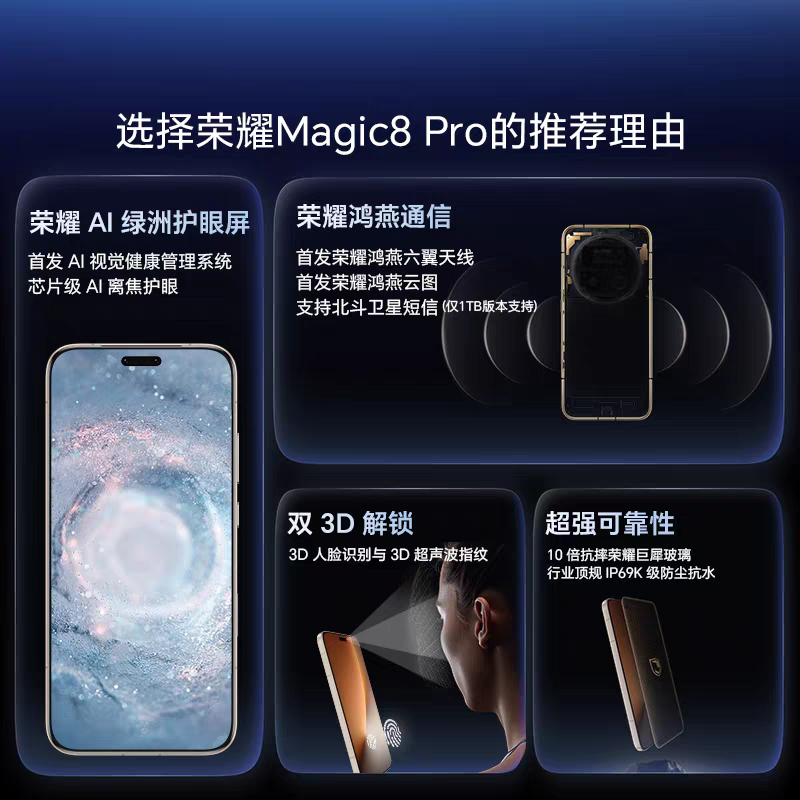 5.其他:MagicOS 10,3D超声波指纹,红外、NFC,X轴马达,鸿燕通信,IP68/69K防尘防水,巨犀玻璃,双扬声器,北斗卫星短信,旭日金砂、雪域白、天青色、绒黑色四色,12+256GB 5699元起!