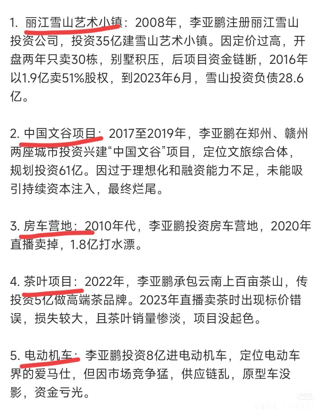 李亚鹏的投资惨案告诉我们,不是做生意的料就不要硬撑着趟商业浑水,否则只会把真金白银砸成一地鸡毛。在丽江雪山艺术小镇,35亿的巨额投资换来的是开盘两年仅售30栋的惨淡业绩,最终资金链断裂,股权贱卖后仍背负28.6亿负债,堪称地产投资的“滑铁卢”。中国文谷项目妄图以61亿的规划投资打造文旅综合体,却因过于理想化和融资能力不足,在郑州、赣州两地双双烂尾,成了城市里的“伤疤工程”。 房车营地项目在2010年代风光启动,最终却以1.8亿打水漂、直播甩卖的结局收场;2022年雄心勃勃承包云南上百亩茶山,计划投资5亿做高端茶品牌,却在2023年因直播标价失误损失惨重,茶叶销量更是惨淡到无人问津;投资8亿进军电动机车领域,立志打造“电动车界的爱马仕”,最终却在激烈的市场竞争和混乱的供应链中,连原型车都没见着就资金亏光。 这一系列投资惨案,暴露了他在商业布局上的诸多问题:对市场需求判断失准,定价脱离实际消费能力;项目规划过于理想化,缺乏对资金链和融资能力的务实考量;跨界时对行业壁垒和供应链复杂度认知不足,且在运营细节(如直播标价)上缺乏严谨性。明星光环或许能带来一时的关注度,但在商业的残酷现实面前,唯有尊重市场规律、做好调研规划、把控运营细节,才能避免一次次“亿元级学费”的缴纳,否则再大的野心也只能沦为商业废墟上的一声叹息。