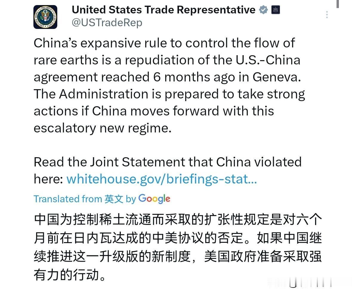 美国发表声明对我们进行警告!10月15日,美国财长贝森特和美国贸易代表格里尔发表声明声称,中国控制稀土流动的扩张规则是对6个月前在日内瓦达成的美中协议的否定。如果中国继续推行这种升级的新体制,美国政府准备采取强有力的行动。 与此同时,贝森特在接受采访时表示,85名参议员已经授权美国总统特朗普对中国购买俄罗斯石油征收500%的关税。对于美国这一声明我们怎么看呢?这样的声明,我们只说明一点,那就是美国是典型的恶人先告状,倒打一耙。无疑,美国对我们警告威胁的意味非常的强烈。 不过,我们必须提醒美国的是,美国妄图对我们实行边谈边打的手段,这对我们是行不通的。而以警告,威胁的方式跟我们打交道,我们也根本不会吃这一套。美国此举,已经严重的违反了中美双方在马德里时的承诺,即双方都承诺不再升级和加码相关制裁或关税。很显然,面对美国的反复勒索,我们有打持久战的准备。跟我们打交道,美国的态度,也必须变一变了。