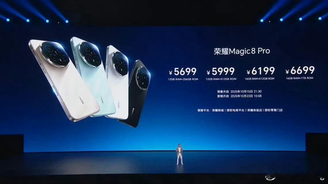 荣耀 Magic 8 Pro售价:12+256G 5699 元,12+512G 5999 元,16+512G 6199 元,16+1T 6699 元 荣耀发布会
