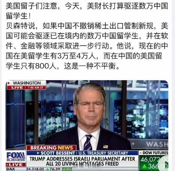 既要中国钱,又防中国才?美国面对商贸战憋住“王炸”。美国财政部长贝森特14日接受美国福克斯新闻网采访,威胁要“驱逐中国留学生” 对“华尔街金融头面招牌人物”贝特森这一威胁我是双手双脚赞同啊! 为啥呢? 根据美国国际教育协会(IIE)表示,美国近4000所高校,依赖国际学生支付,全额学费维持运营,中国留学生占美国国际生四分之一!仅2023-2024学年,就为美国经济贡献就超过140亿美元, 140亿美元,什么概念?相当于美国对华服务贸易顺差的一半,留着这些钱回来建设祖国不好吗?中国留学生可都是宝贵的人才资源。 都说“美国”一听名字就是个自由美丽的地方。我没去过,我不知道。 但当教育沦为筹码时,美国失去的不仅仅是金钱,更是全球学术重心东移的开始! 面对这样的筹码我只能说希望美国越多越好!