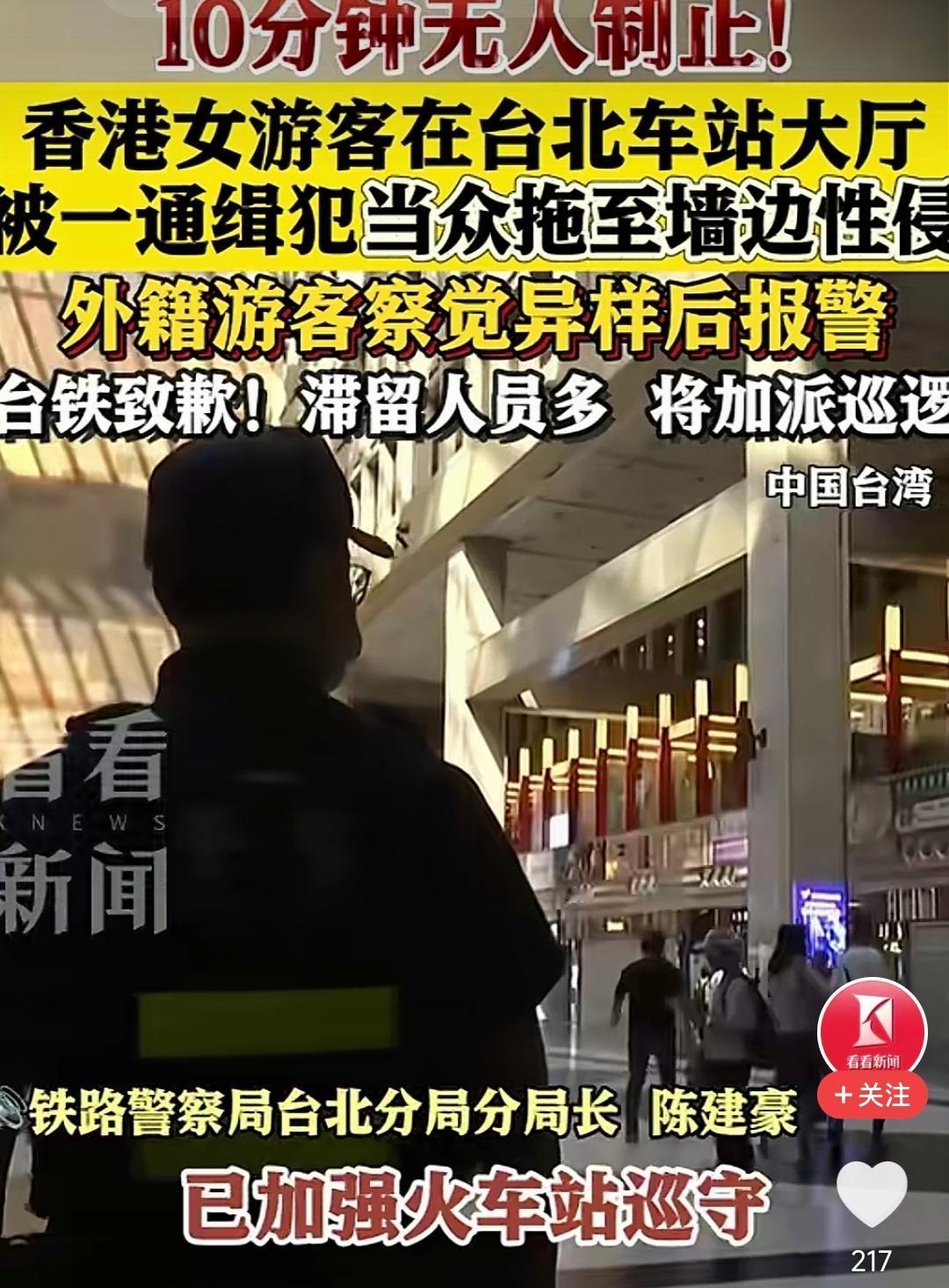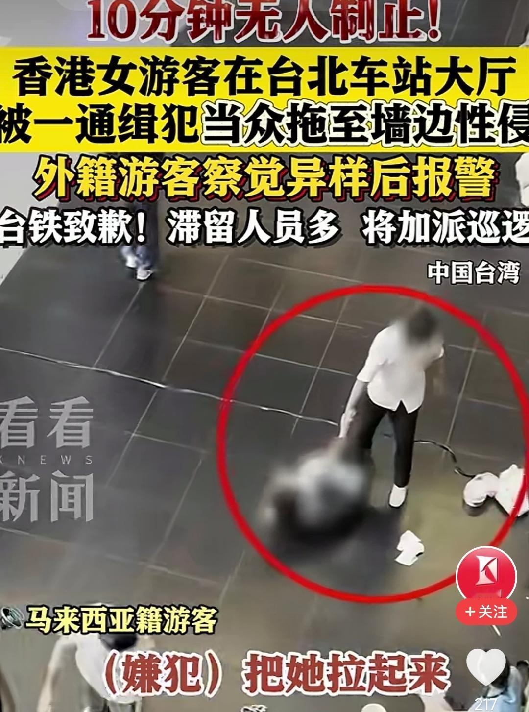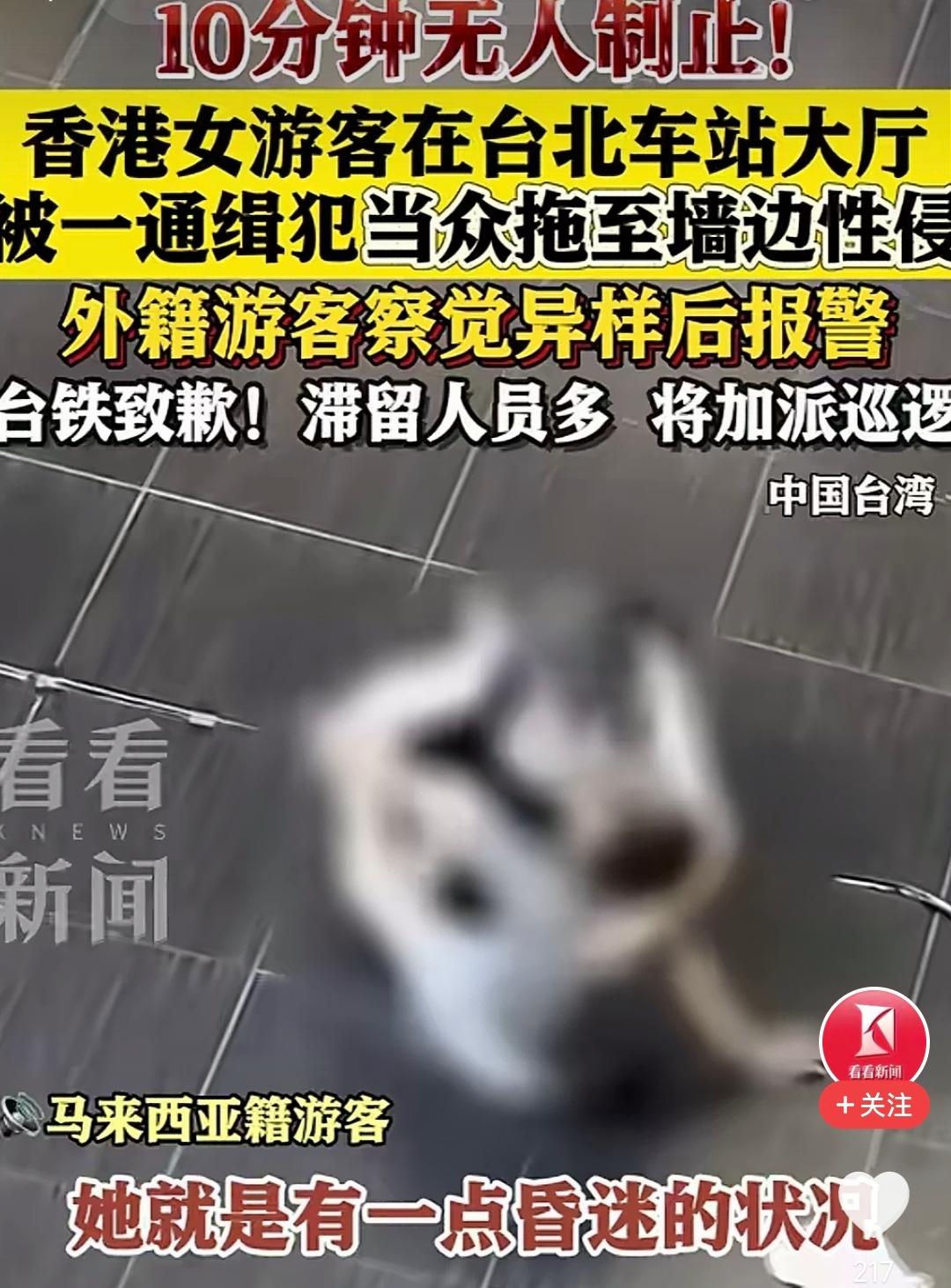 光天化日之下,台北车站这十分钟,让我们看到人的冷漠比恶行更加刺骨! 10月9日下午4时许,一名香港女游客因醉酒,在台北车站大厅倒卧在地。此时,44岁当地男子邱某看到后,竟当着人来人往的民众,明目张胆地将她拖到墙边实施侵犯 。 你敢想象吗?整整十分钟的时间,无数双眼睛目睹了这场暴行,竟无一人上前制止,更没人及时去报警。 最终,还是一名马来西亚的留学生打破了沉默。他从二楼录影取证后,紧急请同行台湾朋友协助报警,这才让恶行终止 。 而当警方赶到时,嫌犯早已逃逸,经调阅监控才将其抓获。 就这十分钟,暴露的不仅是台湾的治安漏洞,更是人性的冷漠。当罪恶在大庭广众下肆意横行时,那些选择沉默,装作看不见的人,在某种意义上来说也是共谋。 外籍人员挺身而出,在场同胞却集体失语,这脸真是火辣辣的疼!当台铁用"遗憾"掩盖失职,又怎能去抚慰受害者受到的伤痛? 在我看来,这个社会比暴行更可怕的,是对罪恶的纵容。比管理缺位更致命的,是责任感的崩塌。若沉默成为了社会常态,那再严密的巡逻也护不住人们心中的安全感。 不得不说,这一次,台湾的“人情味”真扣大分了!
