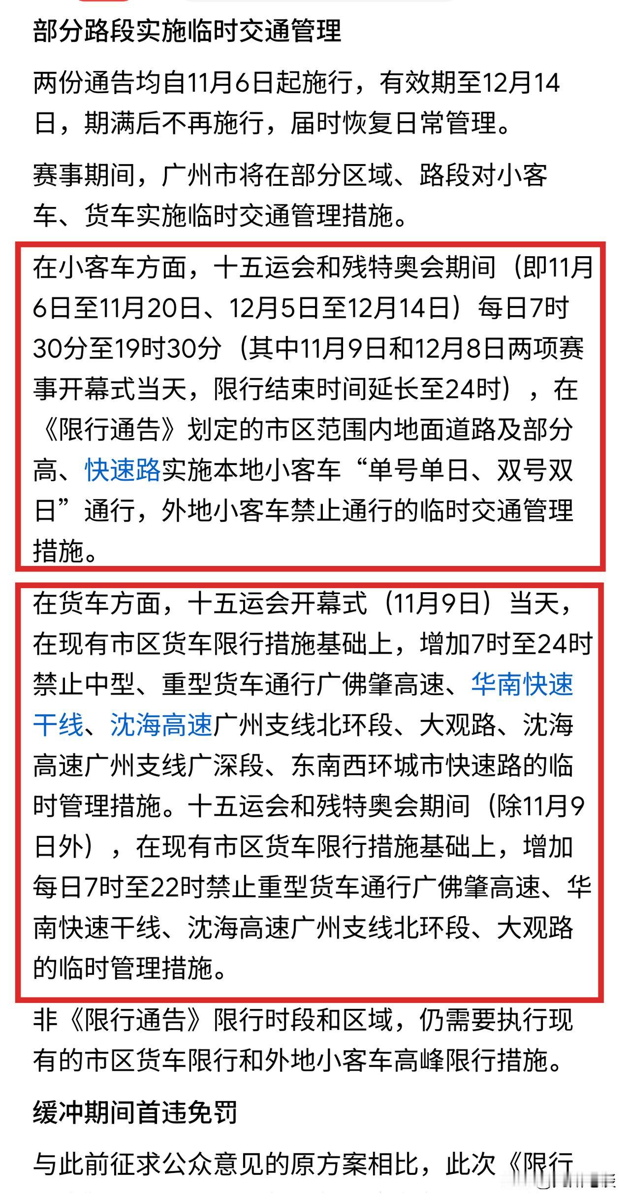 【好消息】全运会和特残奥会期间广州机动车限行方案尘埃落定!海珠区居民成了大赢家! 海珠居民真幸福!海珠区只有全运会期间,即从11月6日到11月20期间限行,特残奥会12月5日到14日期间海珠区全区都不限行。 实际上限行时间段从7点半开始到晚上7点半结束,影响不大。只要在这期间不在限行区域行驶就可以。上班就早点上,下班就晚点回,可以避开限行时间段,除了开幕式当天限行到晚上12点以外。 对居住在海珠区的笔者来说,影响更是小。 只要7点半前通过鹤洞大桥离开海珠区到达芳村就可以了,芳村不限行。 开幕式9号是单数,本身就不限行[呲牙]。 对于搭乘公交车,出租车,网约车的乘客来说,就更幸福了,完全不用担心堵车了,到时候道路交通无比顺畅。 也可以证明堵车的原因是机动车太多,并不是电动自行车造成的。机动车体积庞大,是堵车的主要原因。