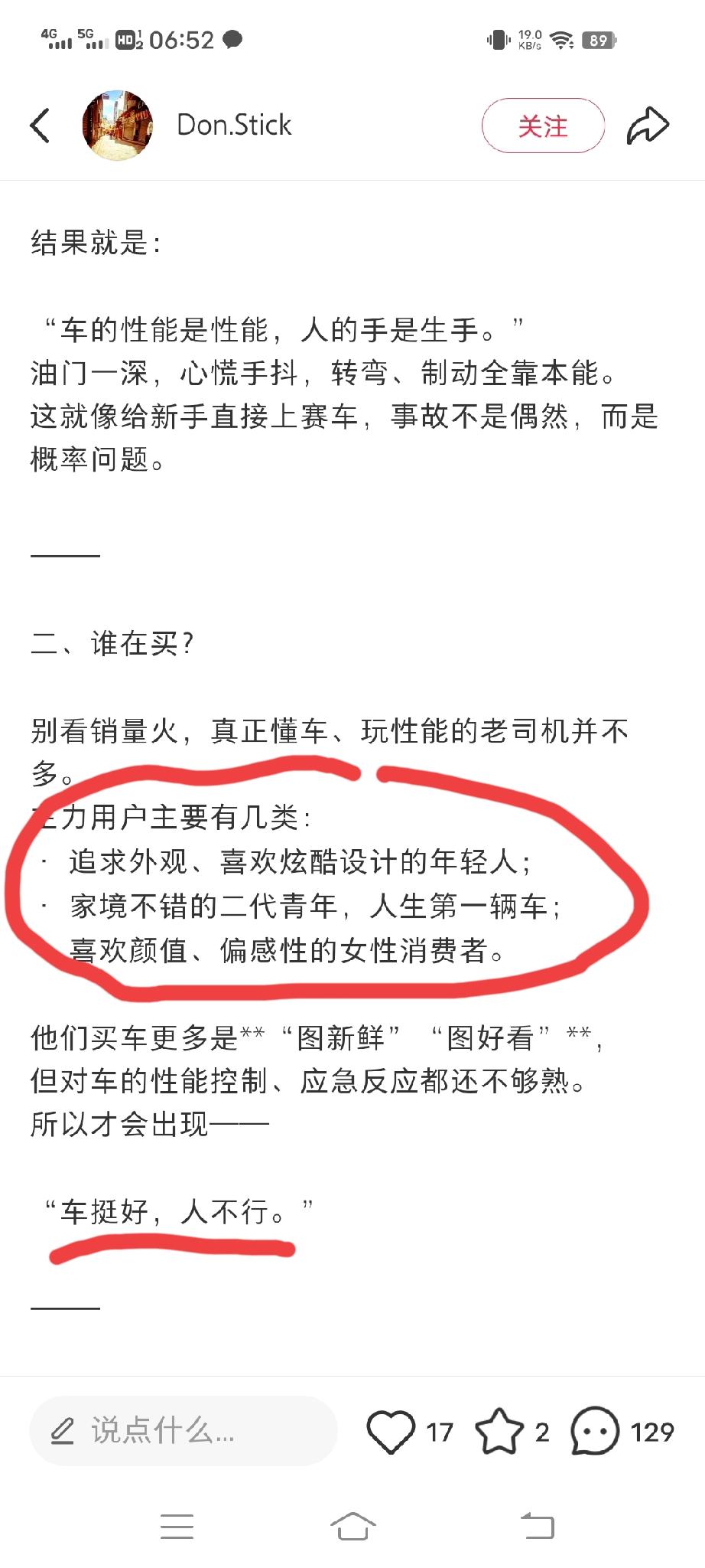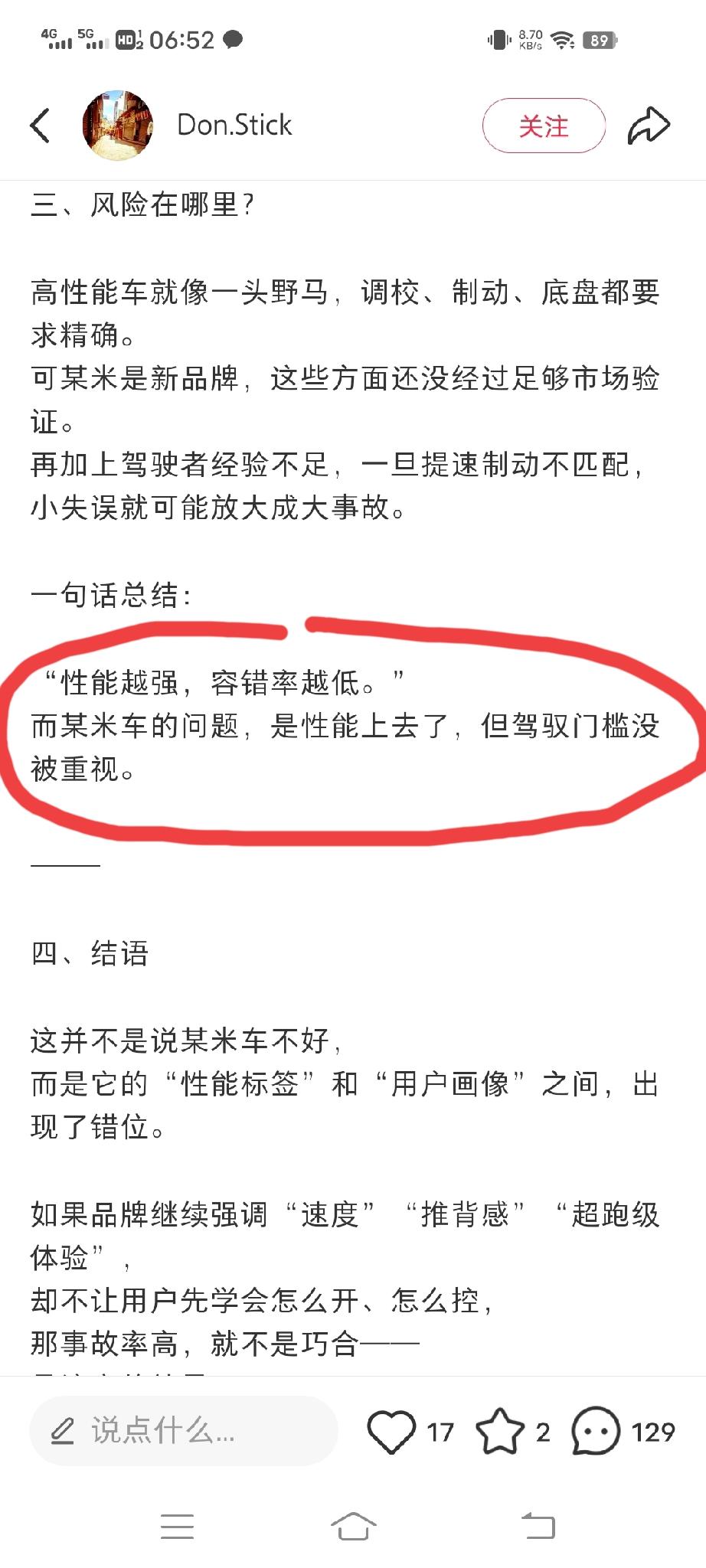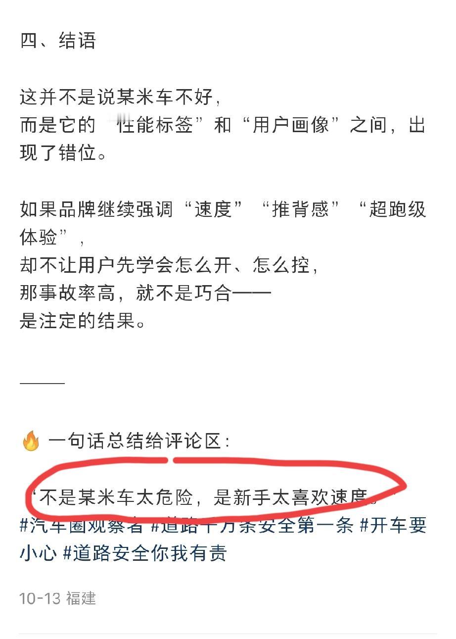 10月13日,成都某地发生某品牌电车碰撞后起火的事故,当天,网上就出现了这样的小作文:“某米汽车事故率高?真正的矛盾在这里”…… 博主洋洋洒洒说了一大堆,得出的结论是“不是某米车太危险,是新手太喜欢速度”。 他在文中说了三点: 1、核心问题:车的性能,超出了人的驾驭能力。 2、谁在买:车挺好,人不行。 3、风险在哪里?性能越强,容错率越低。 …… 网友吐槽:言而总之,出了车祸,是司机的错,车还是好车?这是把事故当天,这么多人在外面救援,门始终打不开这一点黑不提白不提了! 评论区的网友们,你们认可文中的观点吗?