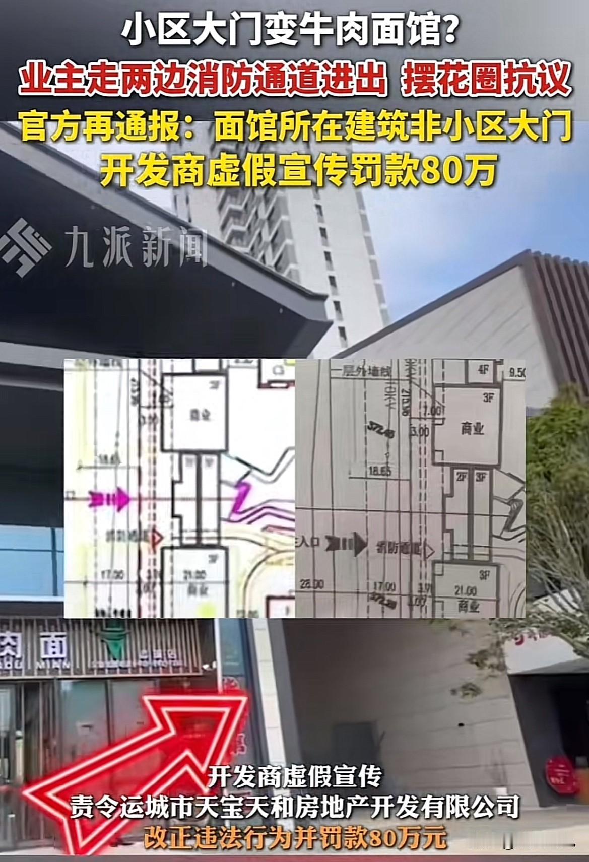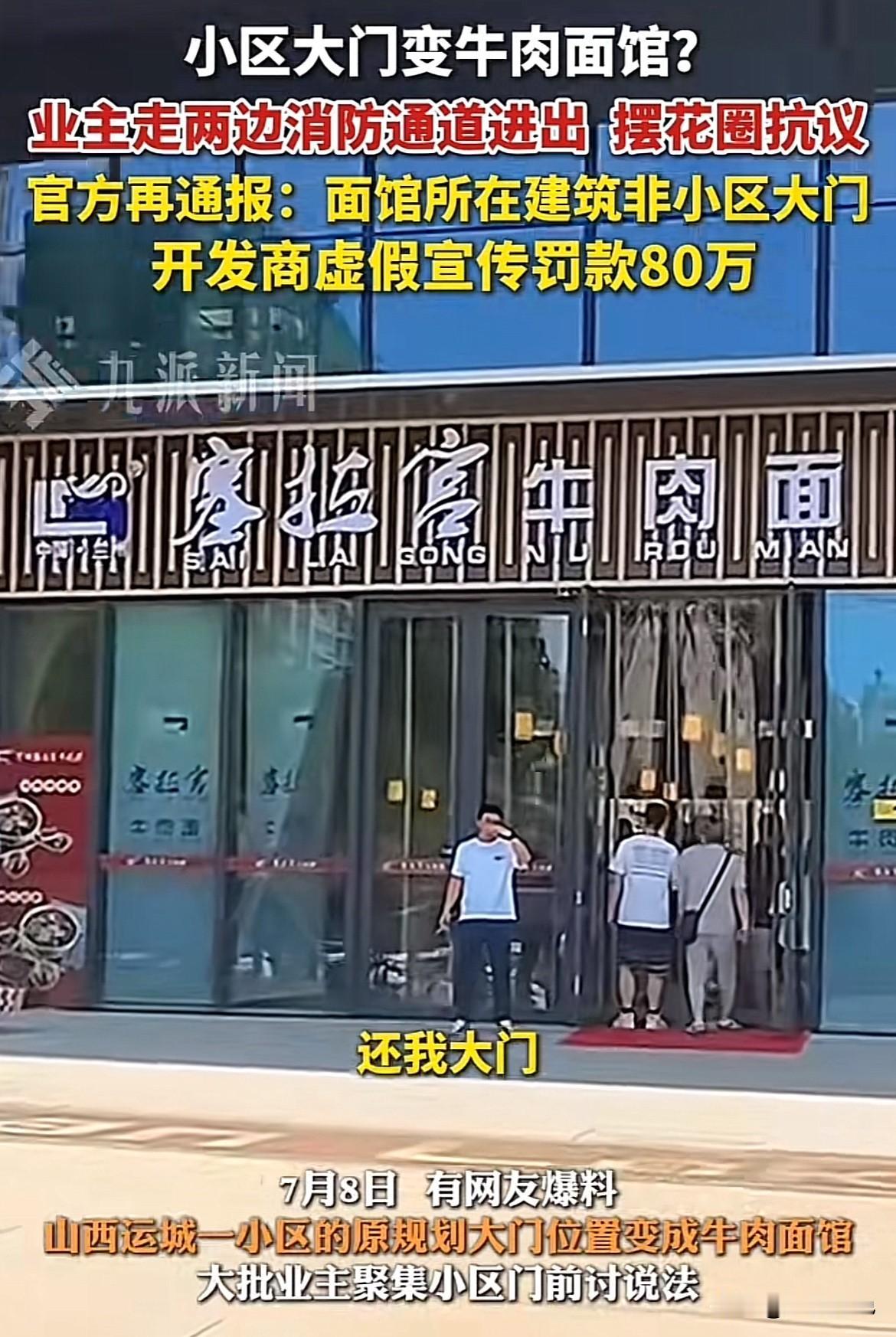 山西运城这小区业主太惨了! 花大价钱买的房,规划大门居然变成了牛肉面馆,只能走消防通道进出,气得业主摆花圈抗议。 结果官方通报说面馆建筑不是小区大门,开发商虚假宣传被罚80万。可这80万罚得再狠,也换不回业主对小区的信任。开发商为了利益虚假宣传,把业主的期待踩在脚下,这种操作真的是把“诚信”二字按在地上摩擦。 买房本是为了安心,结果却被当成韭菜割。你觉得这种虚假宣传的开发商,除了罚款还该怎么治?