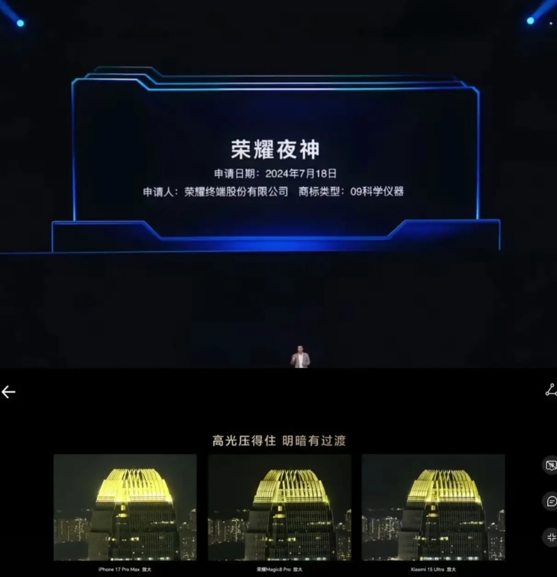昨天看荣耀Magic8系列发布会,发现李健总非常愤怒,原来“夜神”商标荣耀早在2024年7月18日就已经申请了。在这种情况下,友商还“偷用”确实有些过分,难怪荣耀这么气愤,看来荣耀Magic8系列对夜景也很有信心,直接现场对比,这不仅是一个商标,更说明荣耀这方面的努力。